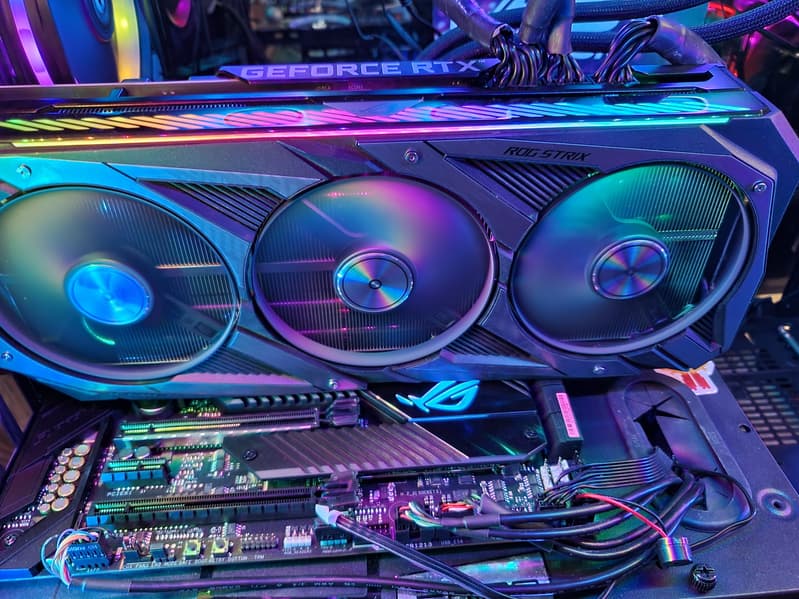 Подсветка у карты реализована на верхнем торце, во вставках около вентиляторов и в логотипе ROG на задней пластине.