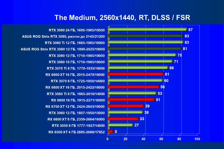Рейтинг составлен по 9 тестам, где используется технология трассировки лучей и где одновременно присутствуют Nvidia DLSS и AMD FSR. Этот рейтинг нормирован по самому слабому ускорителю в данной группе — Radeon RX 6500 XT (то есть сочетание скорости и функций Radeon RX 6500 XT приняты за 100%).