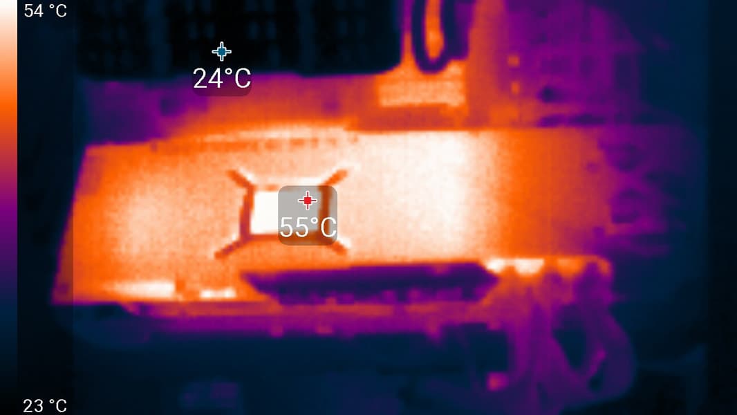 После 2-часового прогона под нагрузкой в OC Mode максимальная температура ядра не превысила 67 градусов, что является великолепным результатом для видеокарт такого уровня. Максимальная мощность была зафиксирована на уровне 397 Вт, а максимальный нагрев наблюдался в центре PCB, и основным источником нагрева являются микросхемы памяти, которые нагревались до 80 °C.