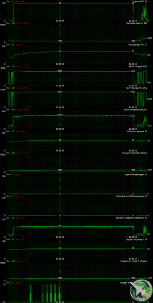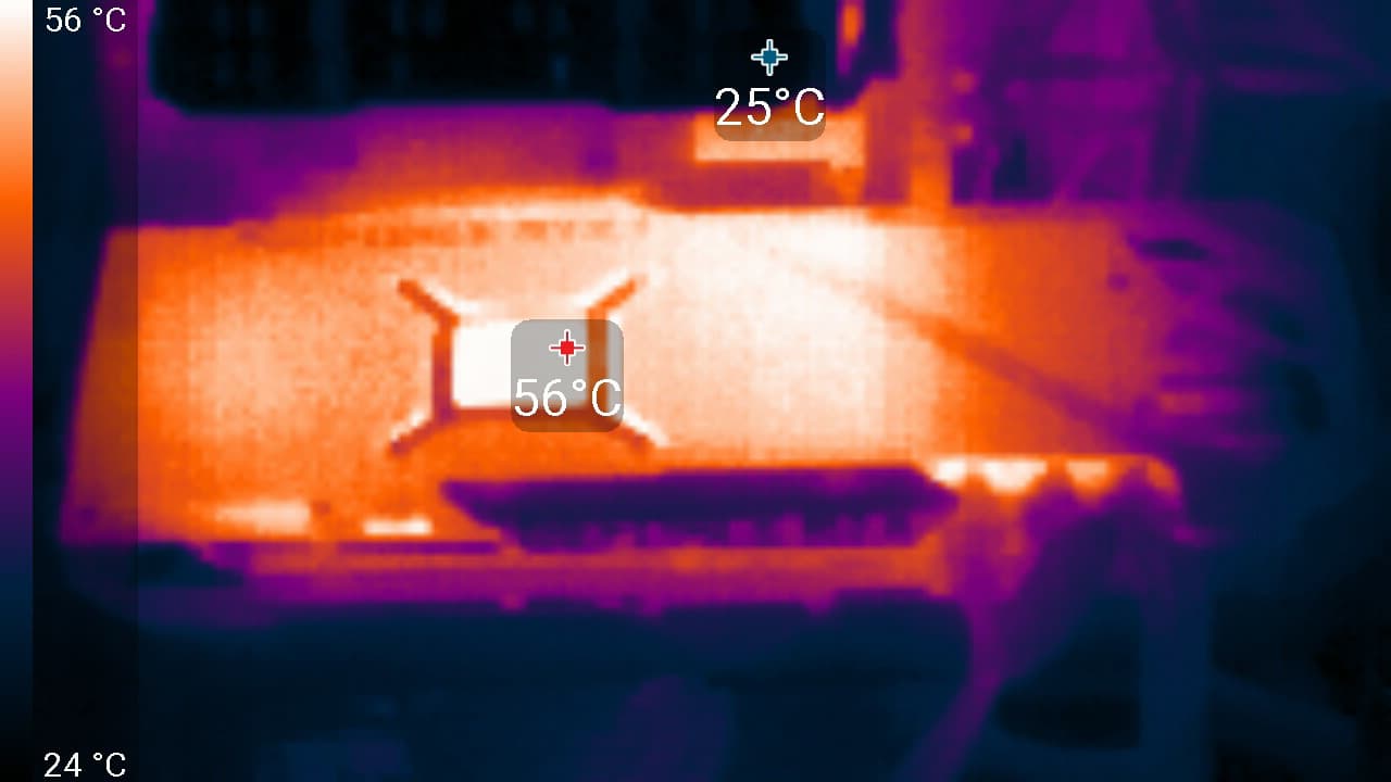 После 6-часового прогона под нагрузкой в OC Mode максимальная температура ядра не превысила 64 градусов, что является великолепным результатом для видеокарт такого уровня. Максимальная мощность была зафиксирована на уровне 358 Вт, а максимальный нагрев наблюдался в центре PCB, и основным источником нагрева являются микросхемы памяти, которые могут нагреваться выше 100 °C.