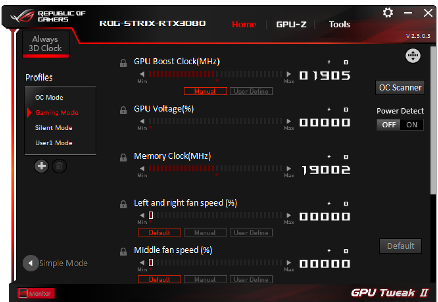 Через фирменную утилиту Asus GPU Tweak II можно включить фабричный режим OC Mode. Разумеется, есть и возможность ручного разгона.