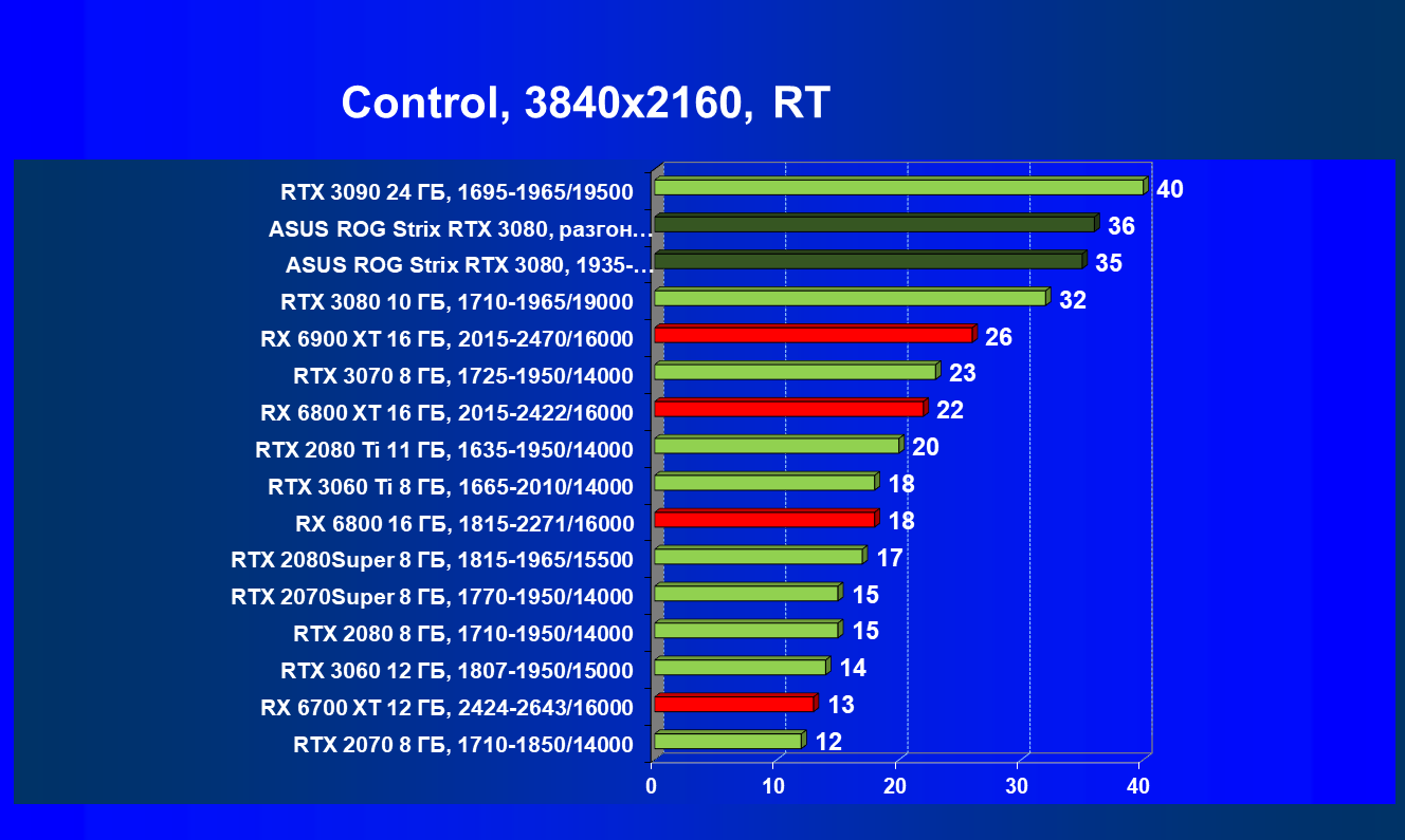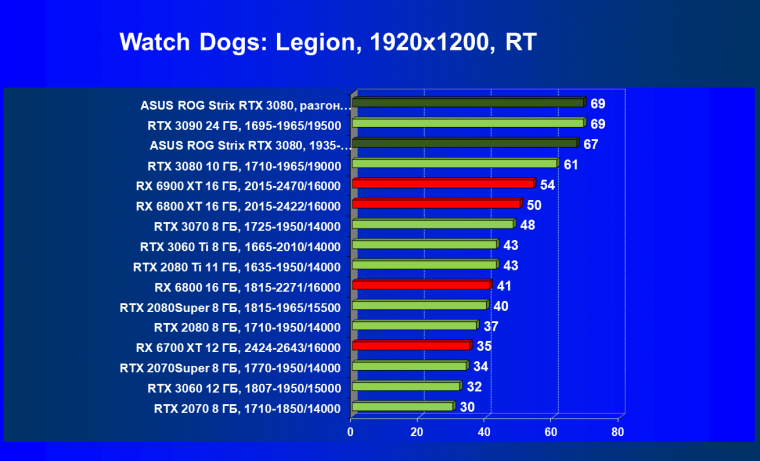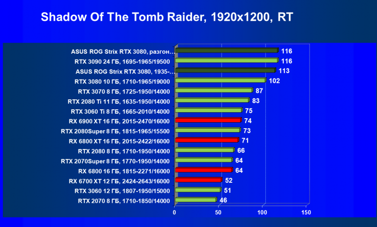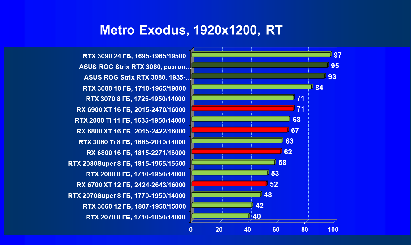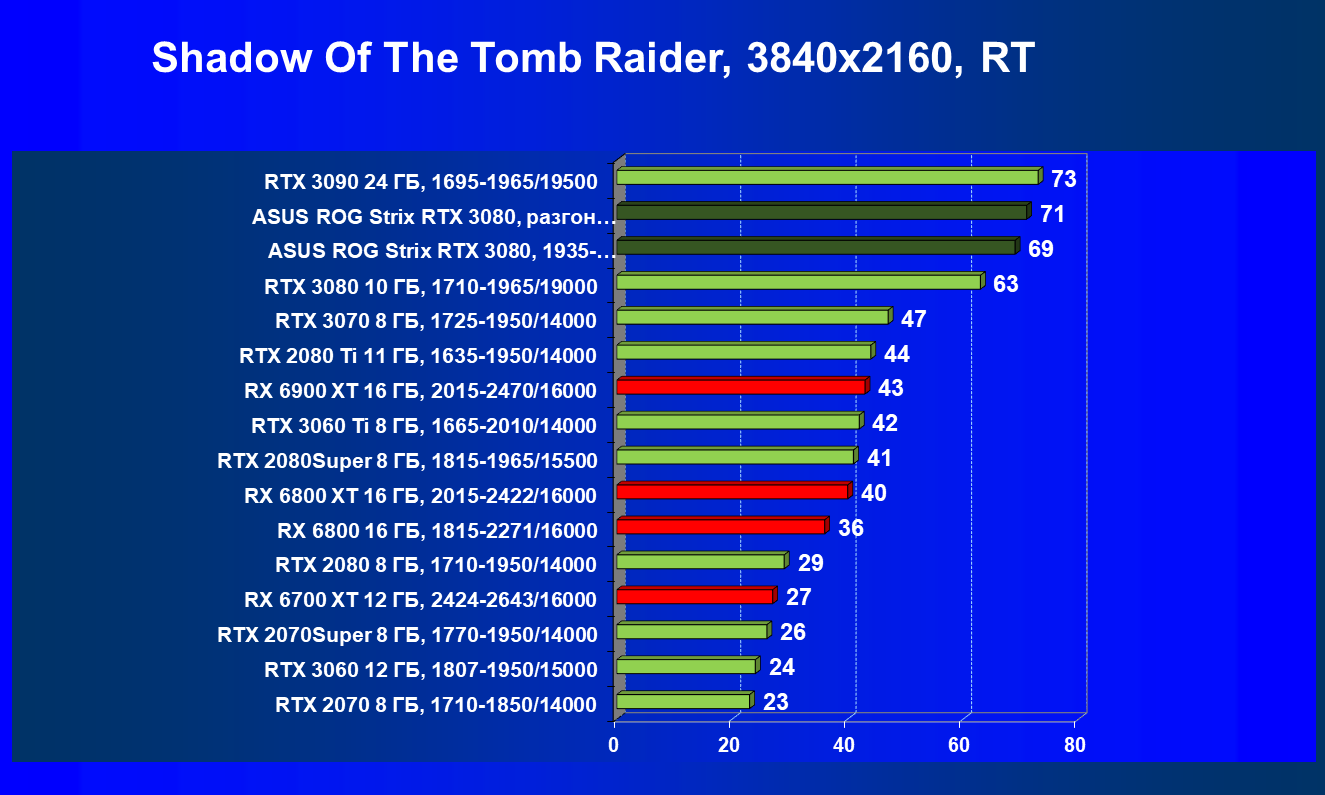 При включении RT производительность Radeon RX 6800 XT и Radeon RX 6900 XT падает намного сильнее, нежели у GeForce RTX 3080, поэтому обе видеокарты AMD оказались ниже в рейтинге. Тем не менее, все они «потянут» 4К с максимальным качеством графики. Карта Asus снова в лидерах за счет повышенных фабрично частот, а также ручного разгона (если не считать GeForce RTX 3090 — разница в ценах между ним и имеющимися в продаже GeForce RTX 3080 сейчас упала до минимума).