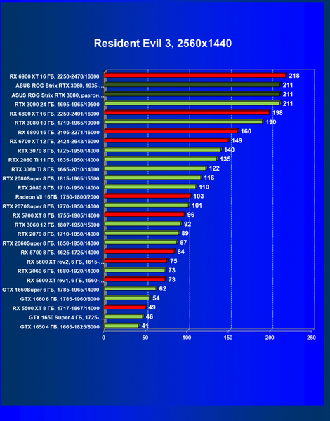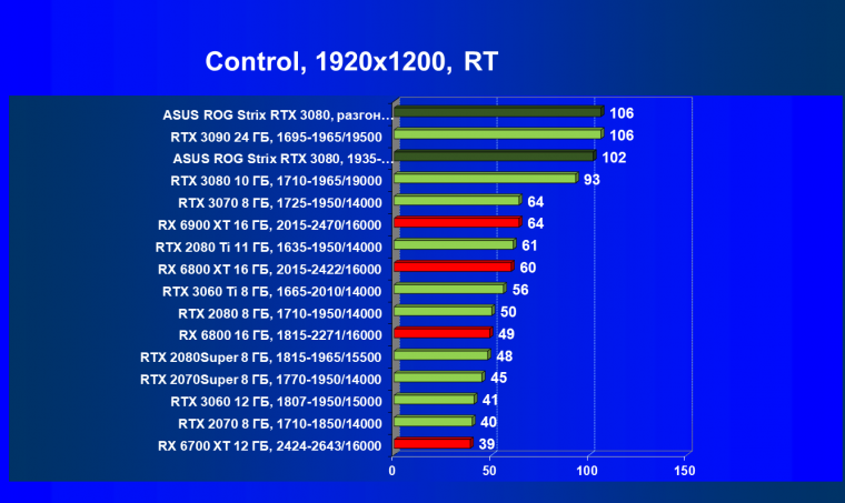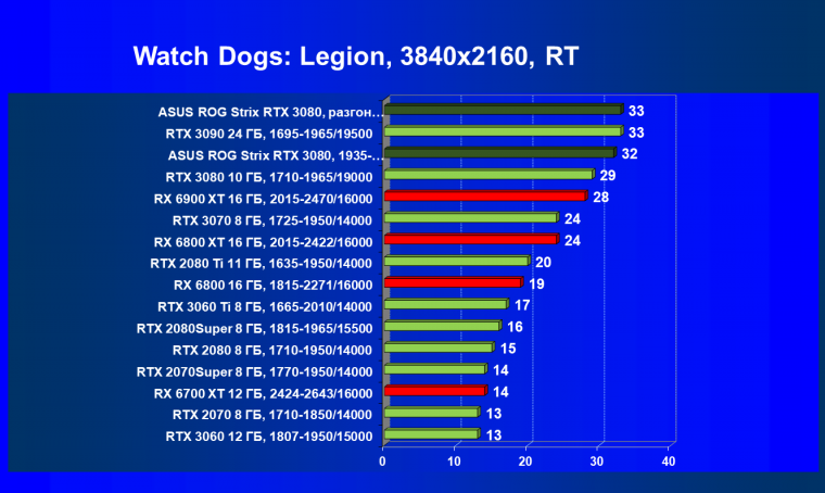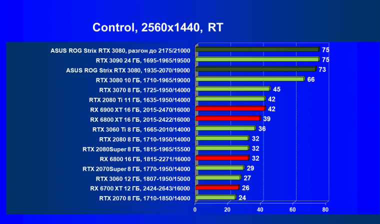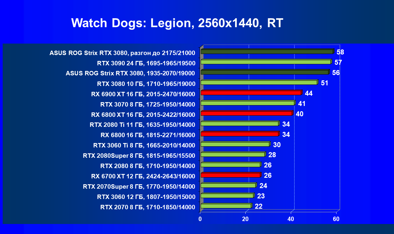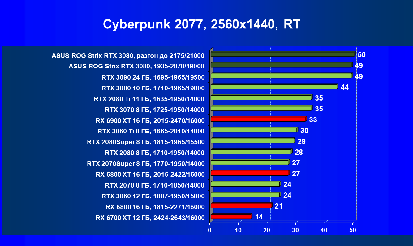 При включении RT производительность Radeon RX 6800 XT и Radeon RX 6900 XT падает намного сильнее, нежели у GeForce RTX 3080, поэтому обе видеокарты AMD оказались ниже в рейтинге. Тем не менее, все они «потянут» 4К с максимальным качеством графики. Карта Asus снова в лидерах за счет повышенных фабрично частот, а также ручного разгона (если не считать GeForce RTX 3090 — разница в ценах между ним и имеющимися в продаже GeForce RTX 3080 сейчас упала до минимума).
