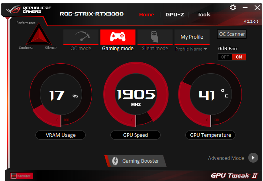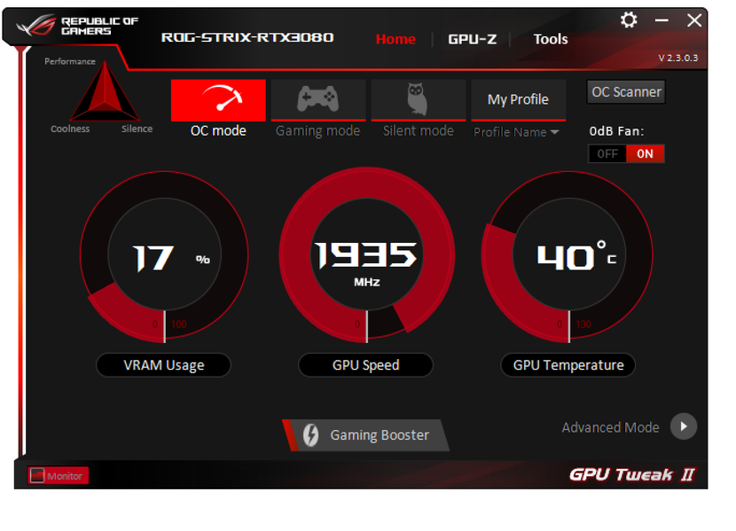 Штатная частота памяти у карты Asus равна референсному значению, а частота работы ядра в режиме по умолчанию (Gaming mode) на 8% выше в бусте и в максимальном значении, нежели у референс-карты. OC Mode поднимает Boost-частоту на 12% относительно референсной величины, однако максимальная частота выше референсного максимума лишь на 9,5%, поэтому суммарно прирост производительности оказался не больше 10%. При ручном разгоне потребление можно поднять до 130%, и на этот раз такой подъем лимита потребления дал эффект: драйверы почти не ограничивали разгон. Карта стабильно работала при разгоне ядра до максимальных 2175 МГц, а памяти — до 21 ГГц. Это примерно на 15% выше референсных величин, и такой разгон обеспечил прирост производительности в 12%-13%.