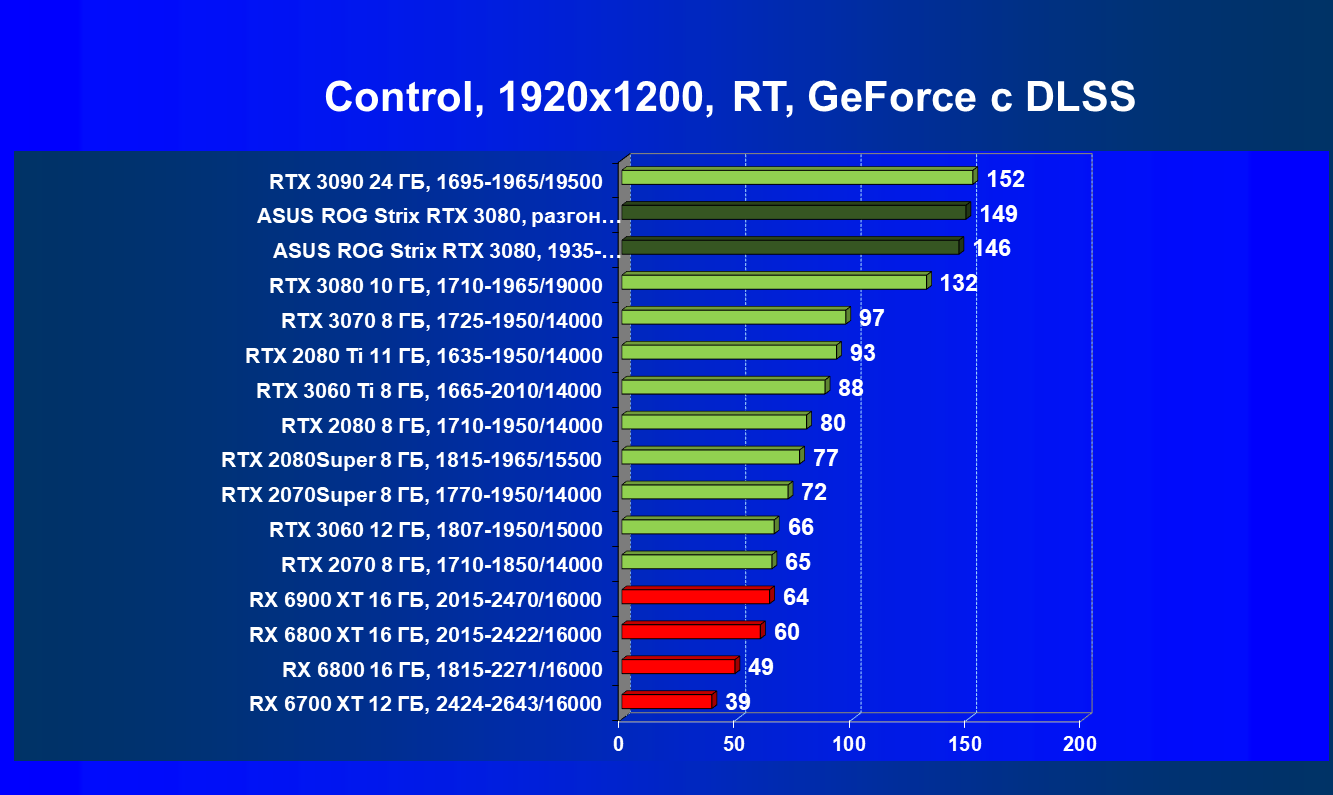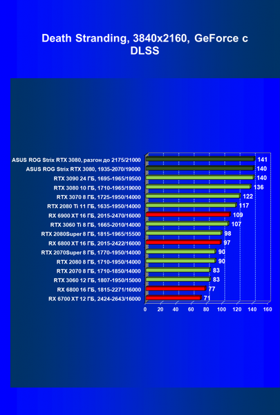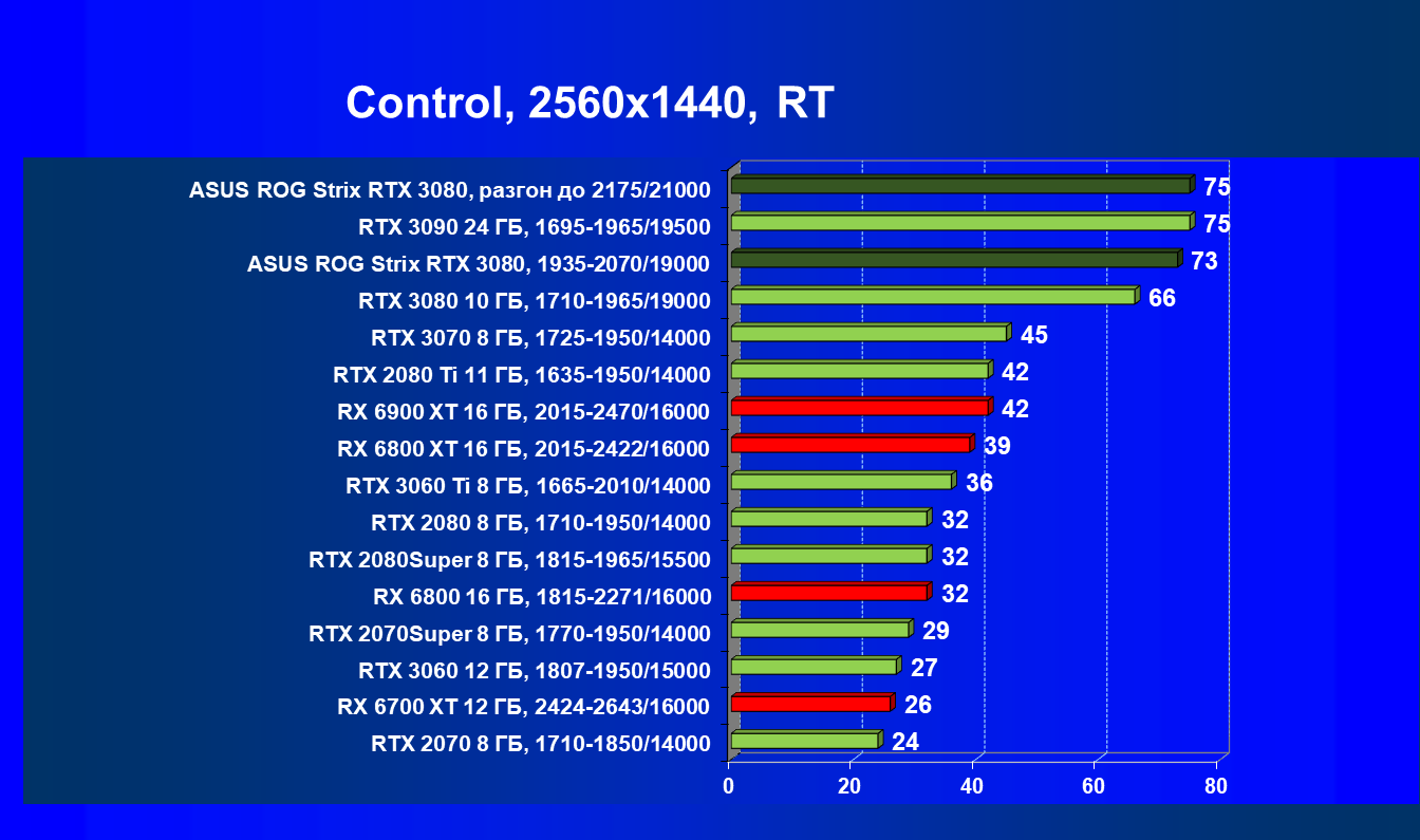 Если говорить об играх с традиционной растеризацией (коих пока большинство), то по производительности к GeForce RTX 3080 очень близок соперник в лице AMD Radeon RX 6800 XT, и оба эти ускорителя нацелены на разрешение 4К при максимальном качестве графики в играх, в котором они могут обеспечить полный комфорт. Однако если в игре используется технология трассировки лучей (RT), то GeForce RTX 3080 становится однозначным лидером, потому что производительность Radeon RX 6800 XT радикально падает, а у серии GeForce RTX, напротив, есть отменный помощник, предотвращающий падение скорости при включении RT — технология DLSS, которой пока нет у конкурентов из стана Radeon. Что касается рассматриваемой сегодня видеокарты Asus, то она ощутимо быстрее референсной Founders Edition.