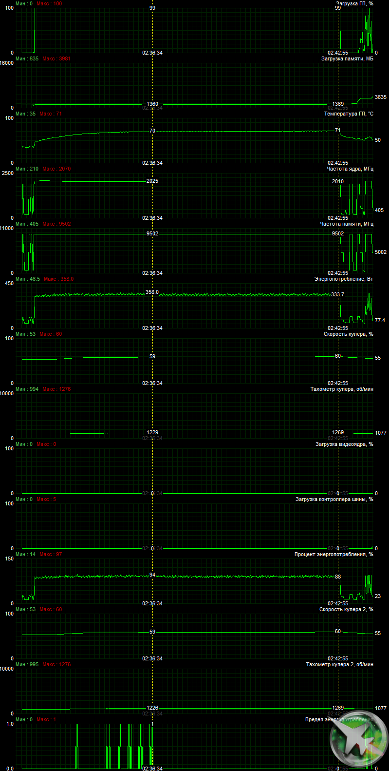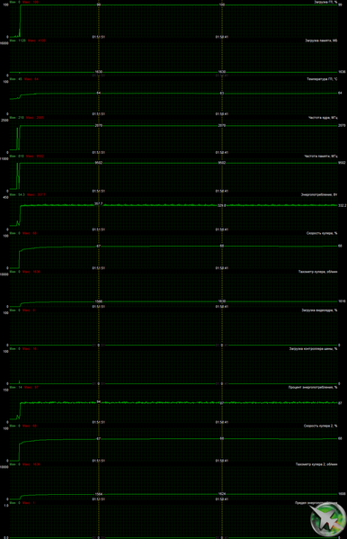 При описанном ручном разгоне параметры работы карты особо не менялись, однако максимальное потребление выросло до 369 Вт.