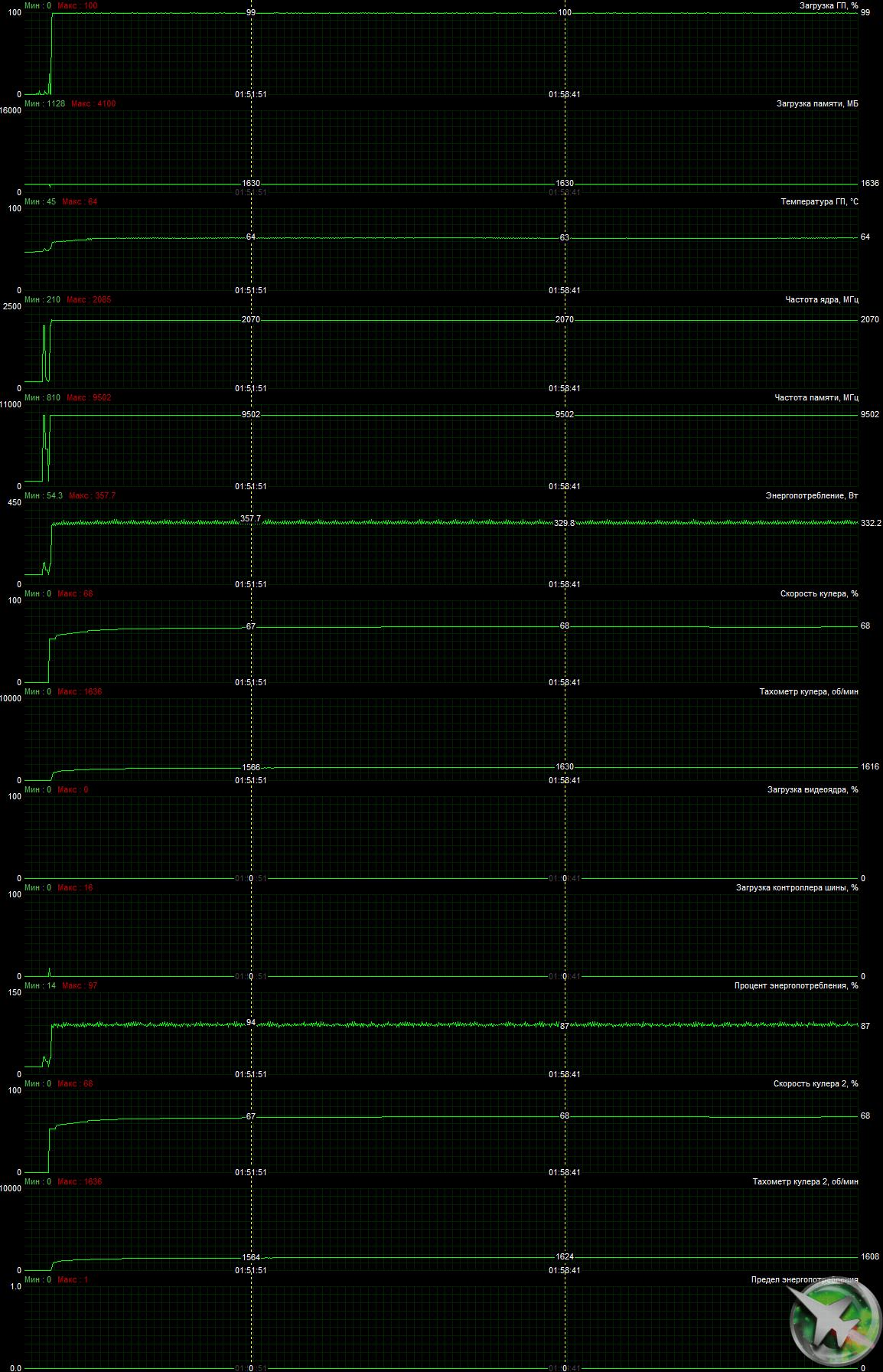 В режиме максимальной нагрузки в 3D температура в Performance Mode достигала 64 °C. Вентиляторы при этом раскручивались до 1630 оборотов в минуту, шум вырастал до 33,0 дБА: это отчетливо слышно. В видеоролике ниже шум фиксировался на пару секунд через каждые 30 секунд.
