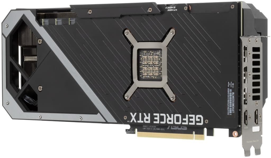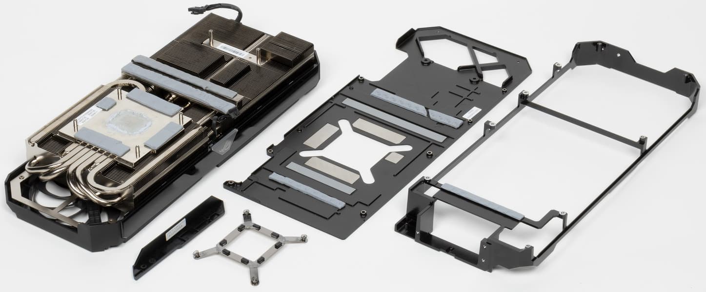 Основой СО является огромный двухсекционный пластинчатый никелированный радиатор с тепловыми трубками, припаянными к подошве прямого контакта с GPU и микросхемами памяти. Этот же радиатор служит охладителем и для компонентов преобразователей питания VRM с помощью небольших подошв. Для остальных мосфетов VRM предусмотрен отдельный радиатор, размещенный на раме, прикрученной к основному радиатору. Задняя пластина выполнена из алюминия с электроизолирующим покрытием и имеет двойное предназначение: служит элементом защиты PCB и через термоинтерфейс участвует в охлаждении микросхем памяти на оборотной стороне карты, а также охлаждает зону преобразователей питания.