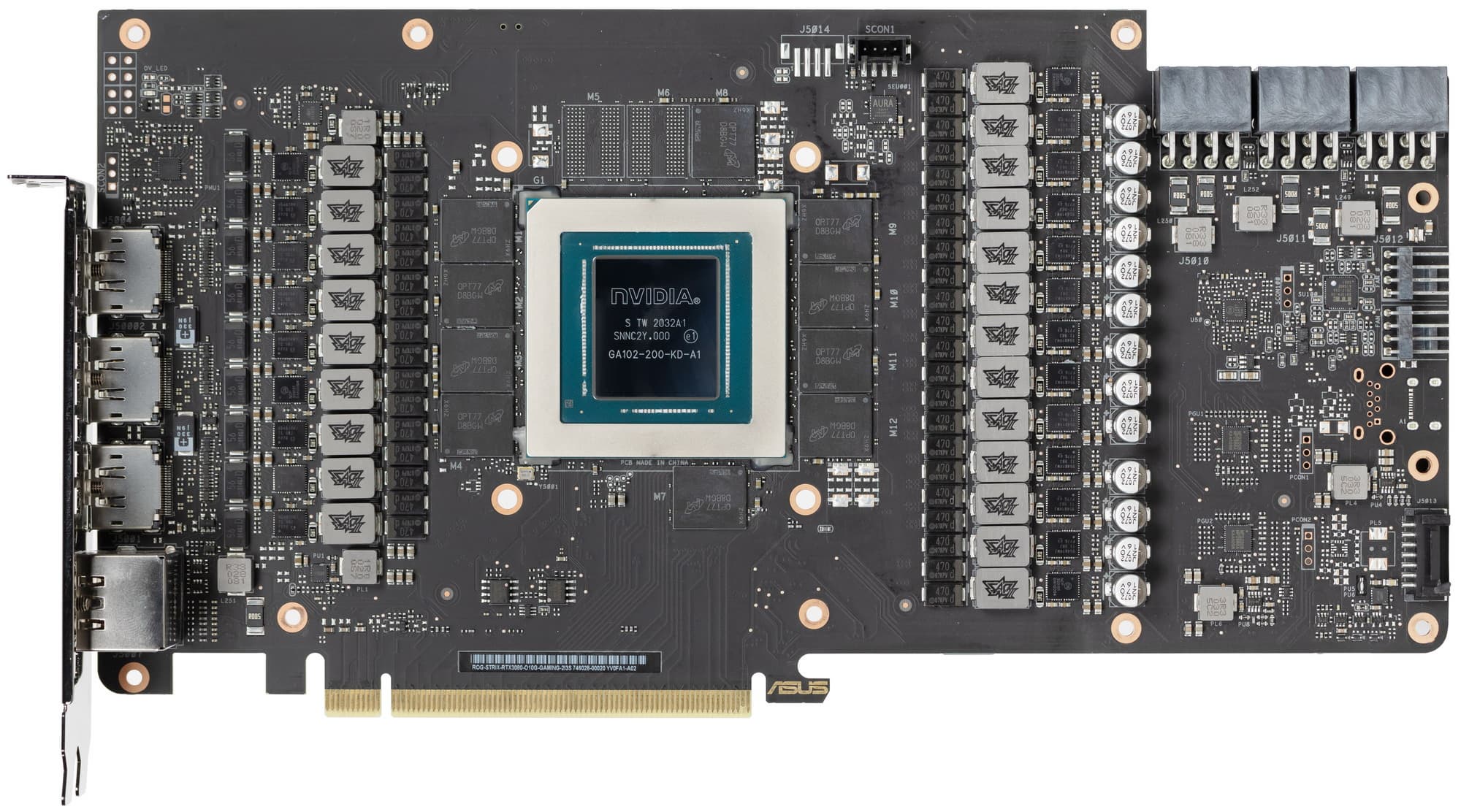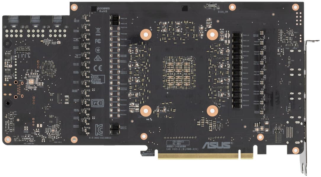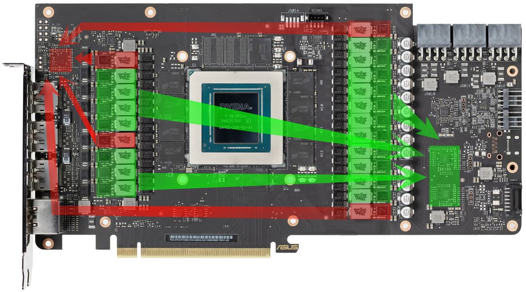 Еще осенью 2020-го в Nvidia спроектировали два варианта дизайна PCB: для своих карт Founders Edition и для партнеров (платы без характерного выреза). Тем не менее, инженеры Asus не воспользовались готовым дизайном и создали собственную PCB, которая лишь в самых общих чертах повторяет эталонный дизайн.