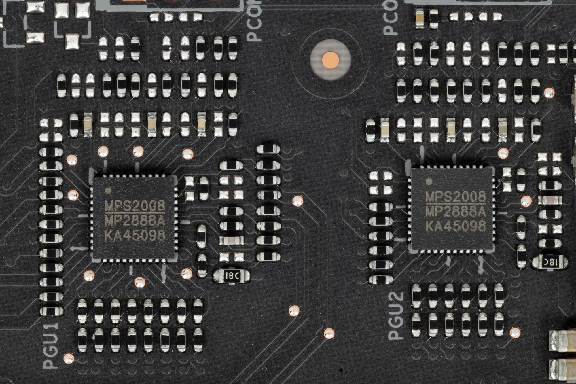 Зеленым цветом отмечена схема питания ядра, красным — памяти. Для управления схемой питания GPU используются два ШИМ-контроллера MP2888A (Monolith Power Systems), каждый из которых способен управлять максимум 10 фазами (реализовано 9+9). Оба расположены на лицевой стороне платы.