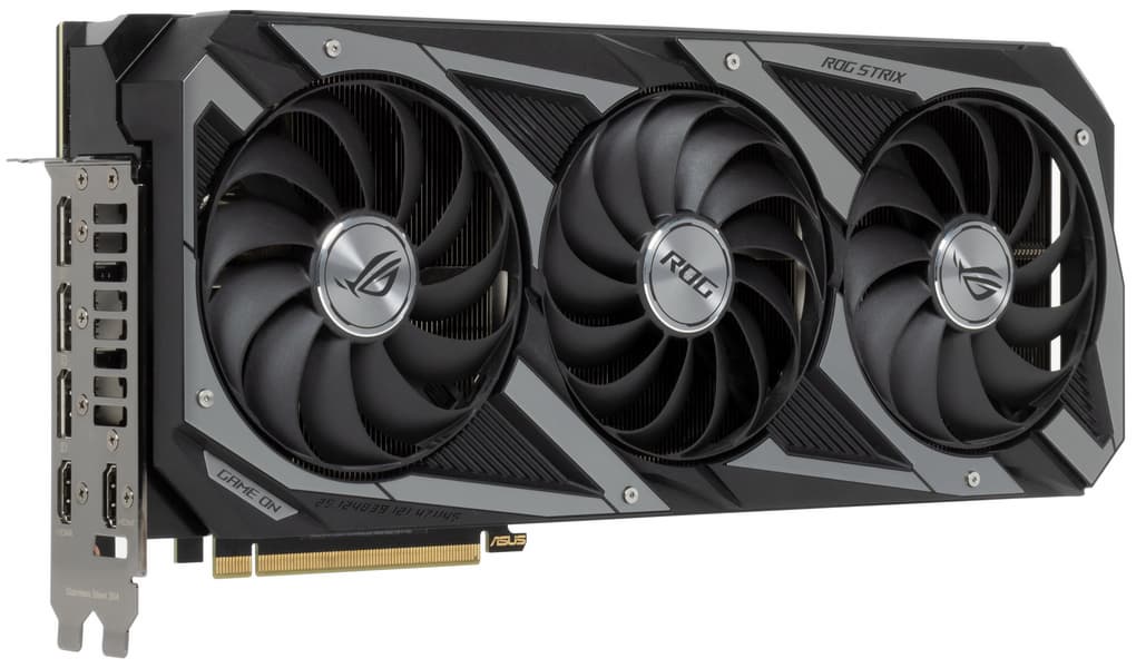 Asus ROG Strix GeForce RTX 3080 OC Edition (10 ГБ) — одна из самых длинных существующих видеокарт, что обязательно надо учитывать при выборе. Система охлаждения просто отменная! Даже в режиме Performance mode шум лишь заметен и не напрягает, а в режиме Quiet mode карта и вовсе работает тихо. Ускоритель может потреблять до 370 Вт, у него три 8-контактных разъема питания, наличие очень мощного БП обязательно. Также желателен хорошо продуваемый корпус, поскольку весь нагретый воздух видеокарта оставляет внутри системного блока.