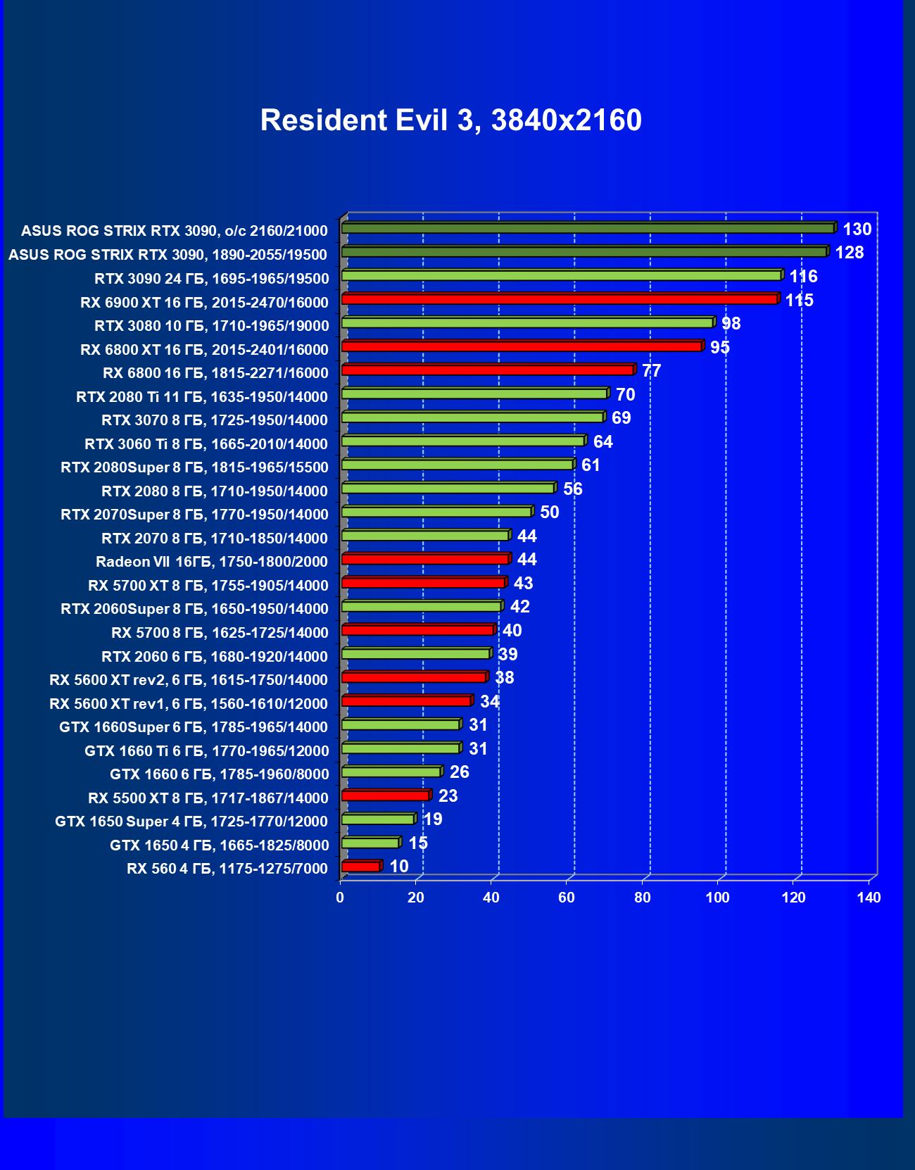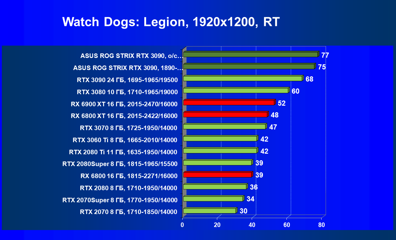 Мы уже знаем, что при включении RT производительность Radeon RX 6900 XT падает намного сильнее, нежели у GeForce RTX 3090, поэтому Radeon RX 6900 XT в рейтинге оказался ниже. Тем не менее, все равно оба конкурента вполне подходят для 4К. Разумеется, карта Asus показала просто рекордный прирост производительности, особенно при ручном разгоне.