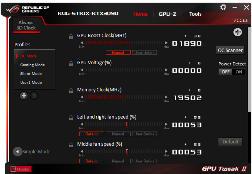 Питание подается через три 8-контактных разъема. Фирменная утилита Asus GPU Tweak II прекрасно работает с этой картой, и именно через нее можно включить фабричный режим OC Mode. Разумеется, есть и возможность ручного разгона.