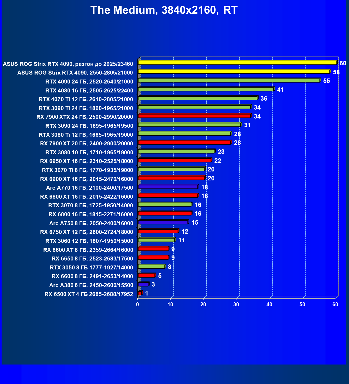 | 26 | Asus ROG Strix RTX 4090, 2550—2805/21000 | 55 | 1103 | 200 000 |