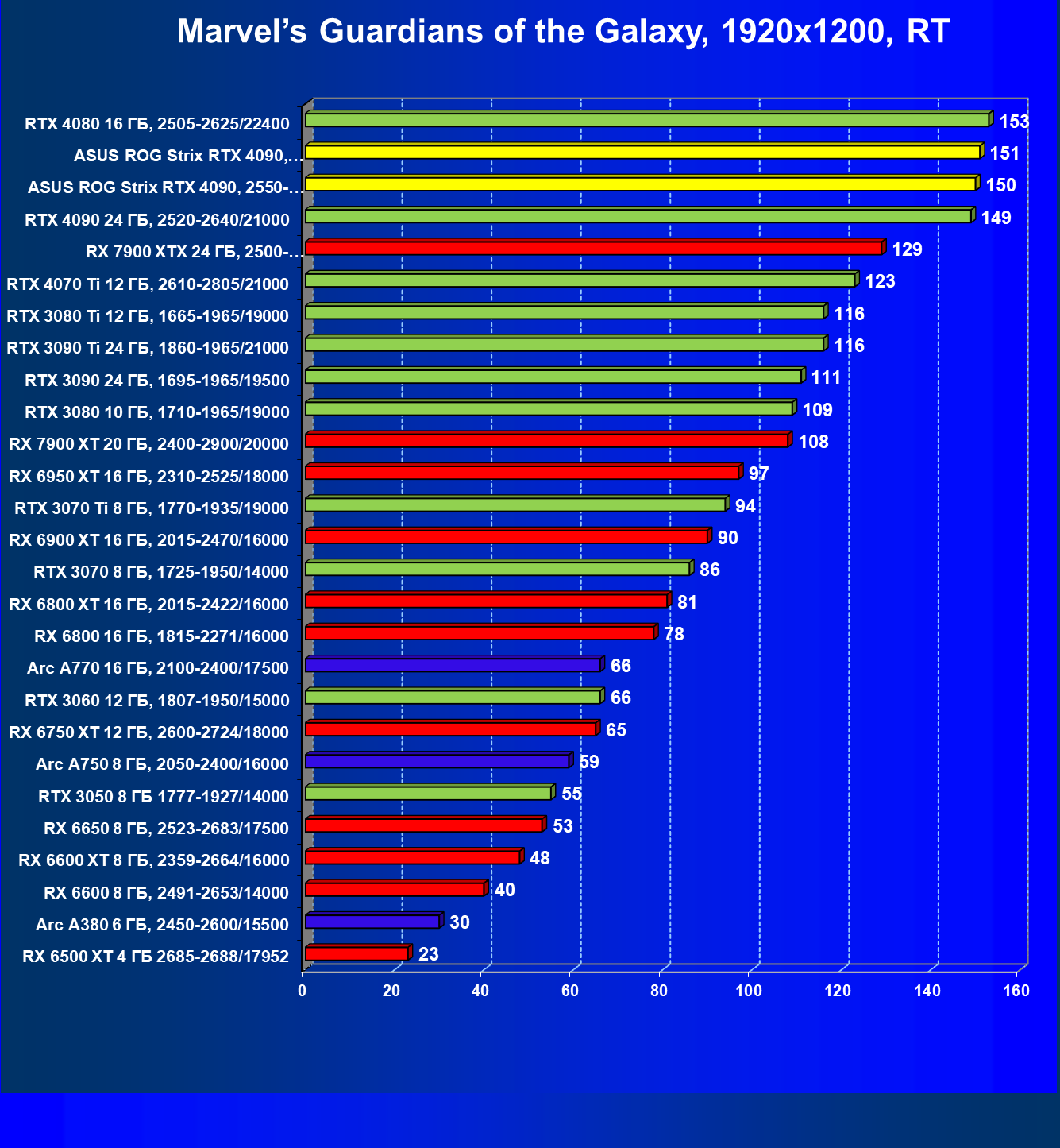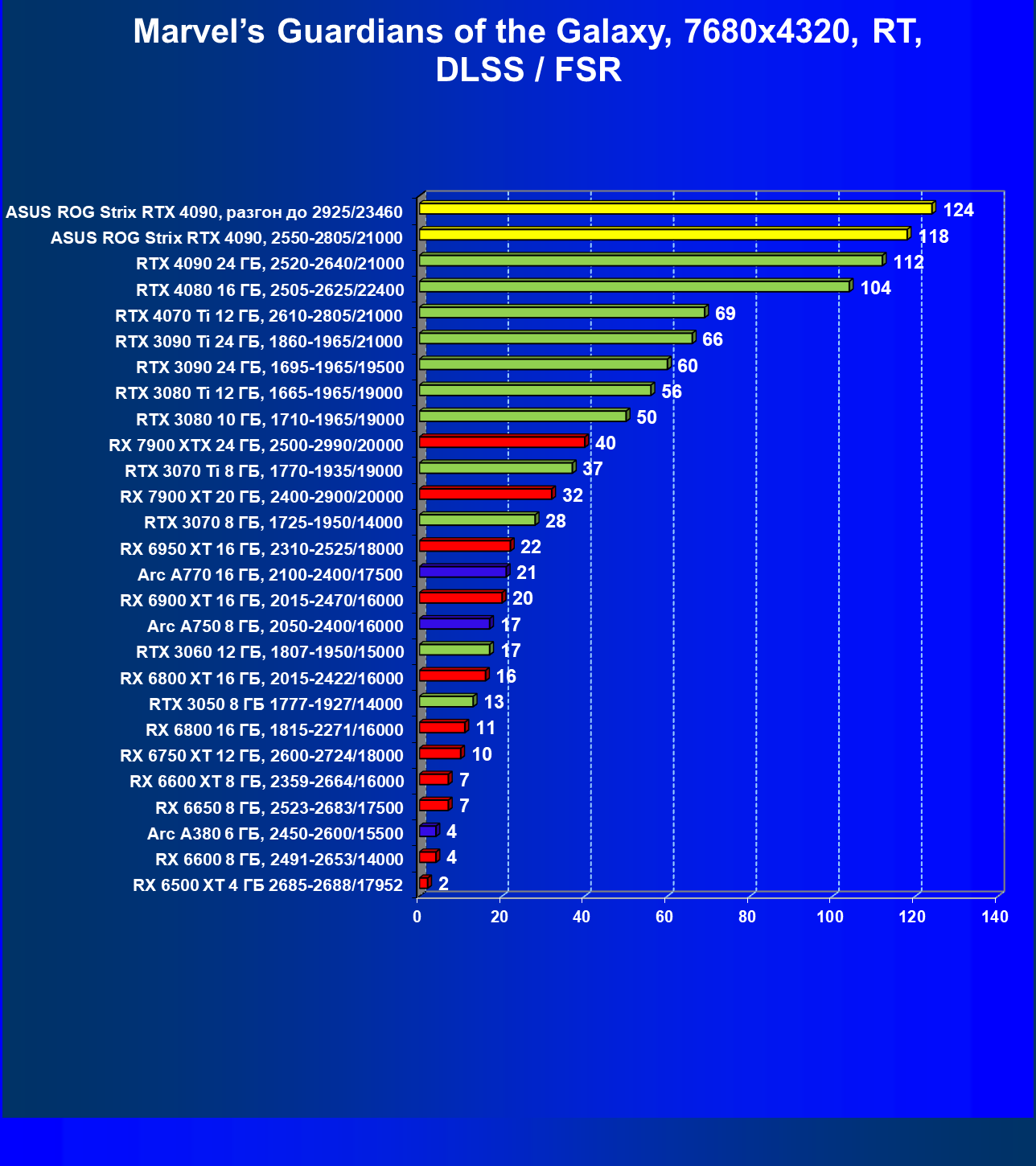 | 23 | RX 6950 XT 16 ГБ, 2310—2525/18000 | 107 | 892 | 83 100 |