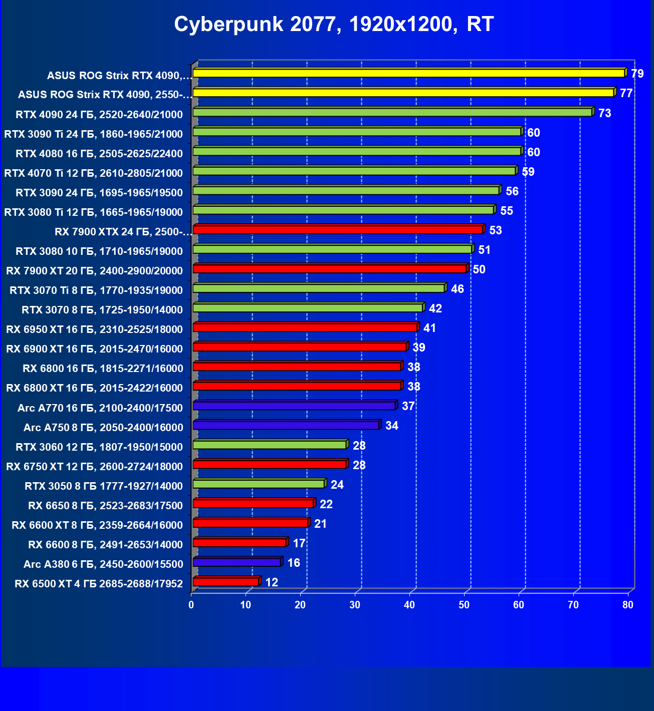 | 26 | Asus ROG Strix RTX 4090, 2550—2805/21000 | 91 | 1829 | 200 000 |