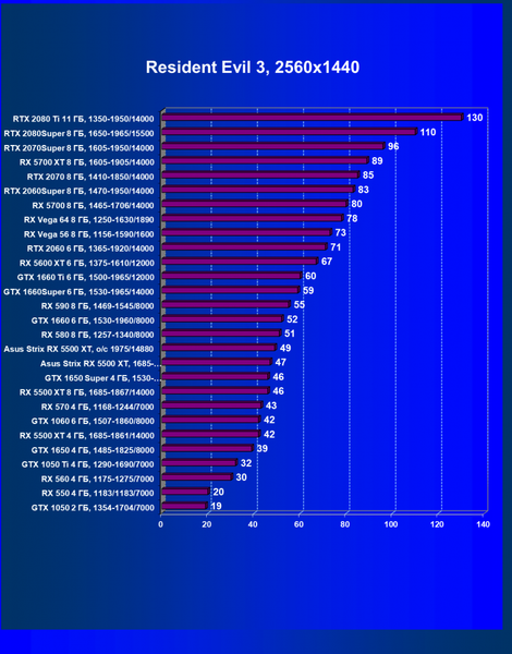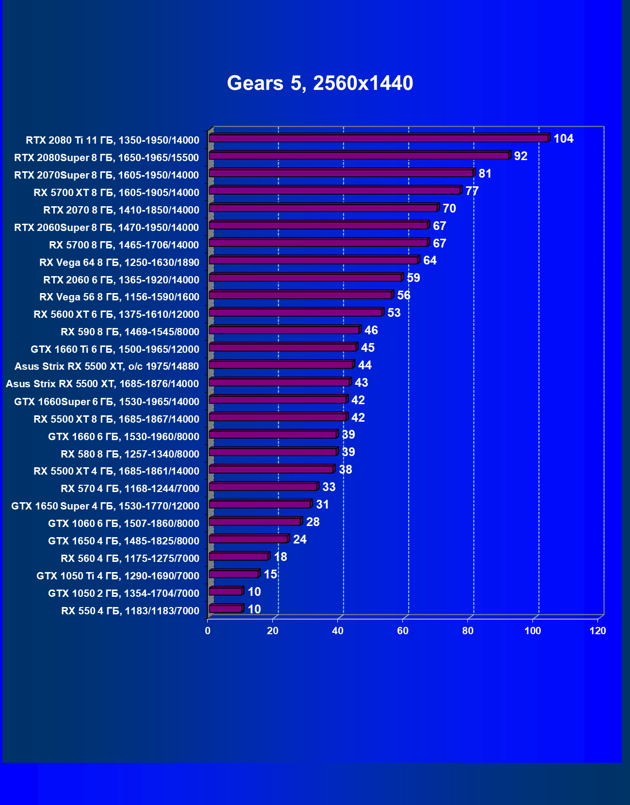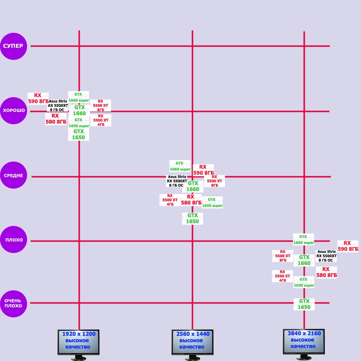 | 18 | RX 5500 XT 8 ГБ, 1685—1867/14000 | 560 | 346 | 16 200 |