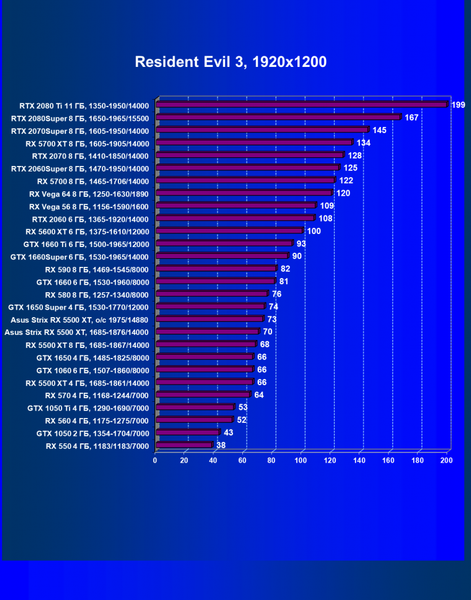 Мы уже знаем, что по скоростным показателям AMD Radeon RX 5500 XT 8 ГБ находится примерно между Nvidia GeForce GTX 1660 и GTX 1660 Super, а также между Radeon RX 580 и RX 590. Этот ускоритель подходит для достаточно комфортной игры при максимальных настройках качества в разрешениях до 1920×1080/1200 включительно, а вот замахнуться на разрешение 2560×1440 не получится, придется снижать настройки качества графики. А в некоторых играх с особо тяжелой графикой придется несколько снизить настройки графики и для Full HD.