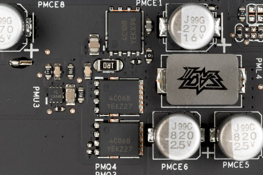 Возможностей данного контроллера, по всей видимости, достаточно для честного управления фазами питания. В результате имеем 7 сборок типа DrMOS — Vishay Intertechnology SiC632A (до 50 А каждая). Традиционно для Asus, система питания исполнена по технологии Super Alloy Power II, в ней использованы современные твердотельные конденсаторы.