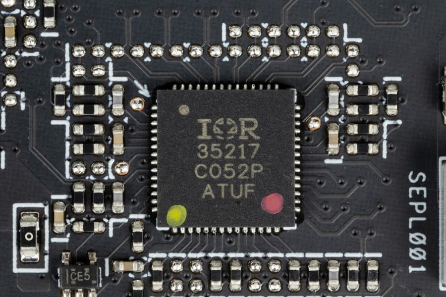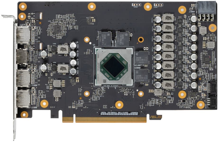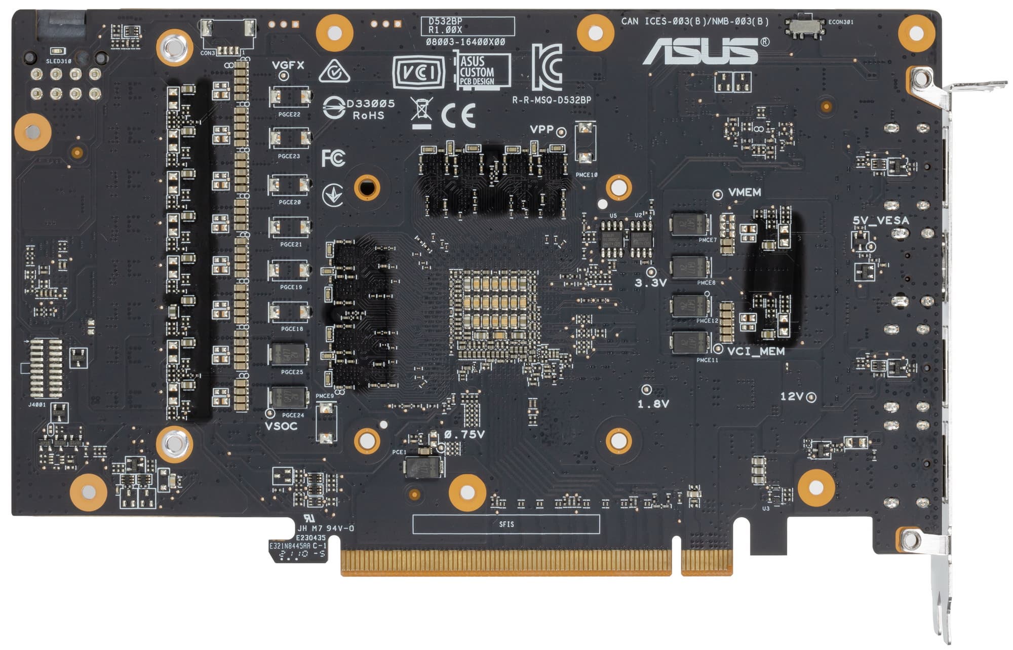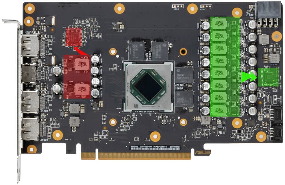 Мы сравниваем с картой от Sapphire только потому, что другого вариант 6600 XT у нас нет и не было (AMD не предоставила референс-карту). Как мы видим, в целом карты во многом схожи, поскольку обе основаны на эталонном дизайне.Суммарное количество фаз питания у карты Sapphire и у карты Asus одинаковое — 10.