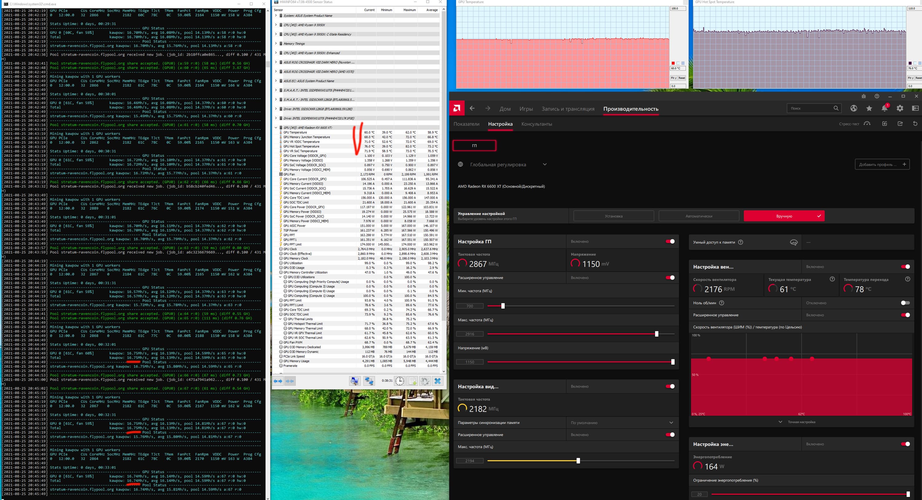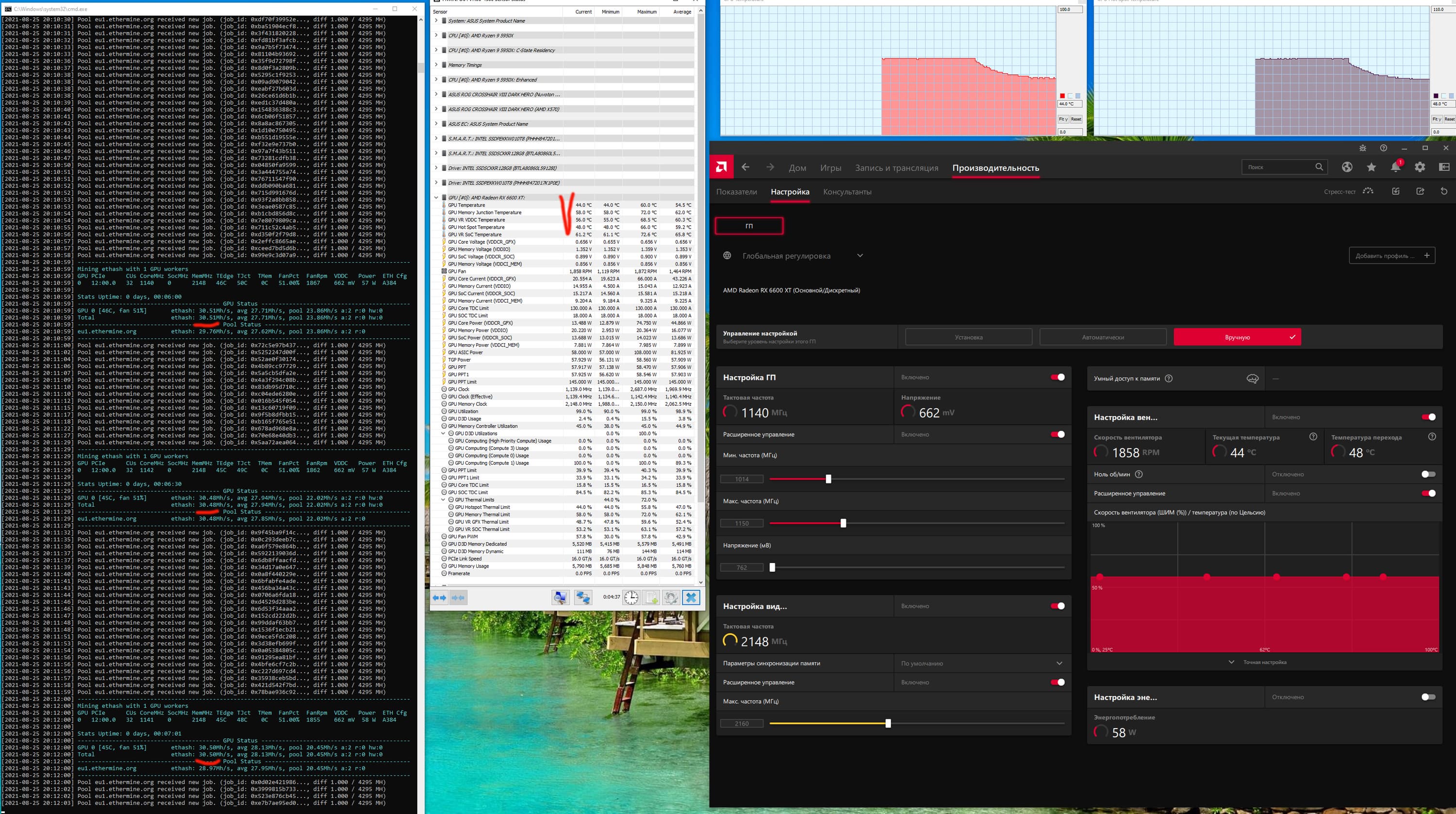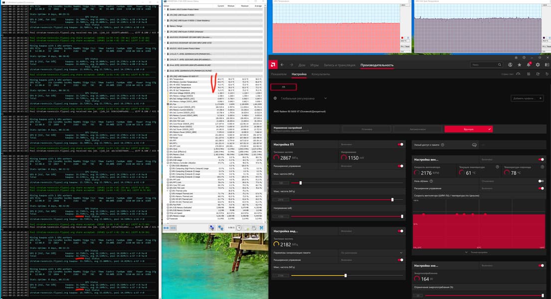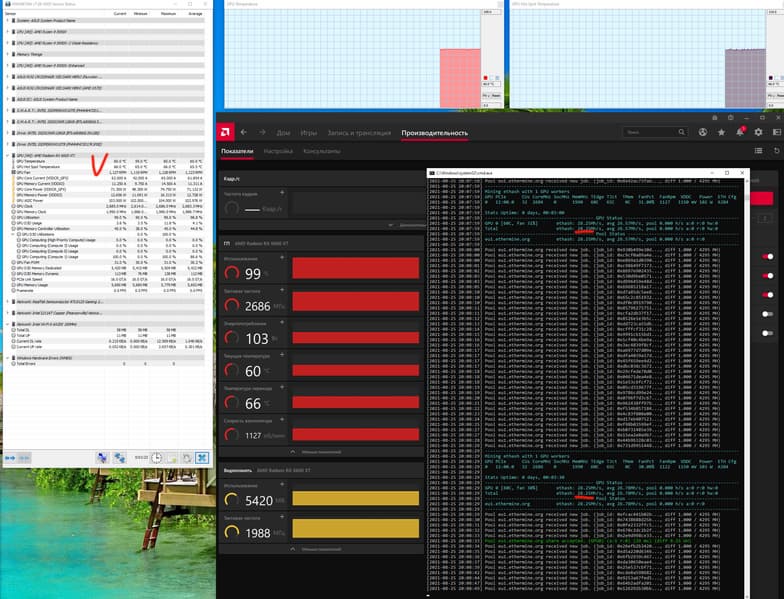 Для подсчета хэшрейта (hashrate) при майнинге «эфира» (Ethereum/ETH/ETC) и «вороны» (Ravencoin/RVN) использовался майнер T-Rex (0.21.06), фиксировался средний показатель за час в двух режимах: