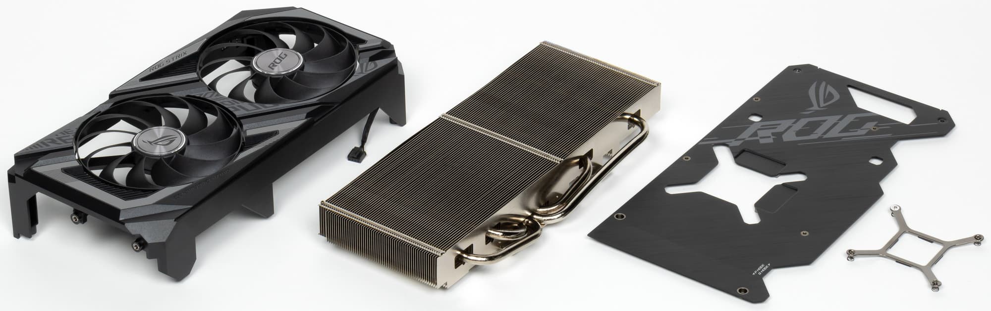 Опять же по традиции ROG Strix основой СО пластинчатый никелированный радиатор с тепловыми трубками, припаянными к подошве прямого контакта с GPU и микросхемами памяти, просто в данном случае радиатор односекционный и не такой большой в целом, как мы видели ранее у продуктов в серии ROG Strix. Этот же радиатор служит охладителем и для компонентов преобразователей питания VRM с помощью небольшой подошвы. Задняя пластина выполнена из алюминия с электрозащитным покрытием и имеет двойное предназначение: служит элементом защиты PCB и через термоинтерфейс участвует в охлаждении оборотной стороны карты в зонах микросхем памяти и преобразователей питания.