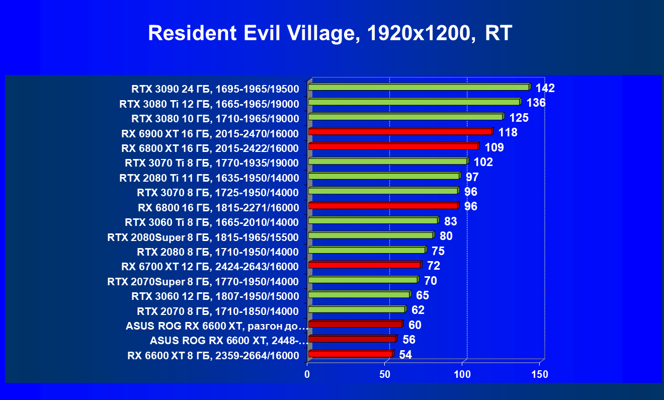 Как у всех видеокарт на базе семейства графических процессоров последнего поколения RX 6000, мы наблюдаем очень сильное падение производительности в играх с RT. Разумеется, падение скорости есть и у конкурентов из стана Nvidia, но там оно не такое сильное, как у Radeon. Поэтому если мы говорим об RX 6600 XT, то во многих играх придется понижать настройки графики, чтобы при использовании RT получить приемлемый комфорт, и это даже в Full HD, не говоря о более высоком разрешении. Впрочем, есть игры, где и с трассировкой лучей 6600 XT показывает неплохую скорость в том же Full HD.
