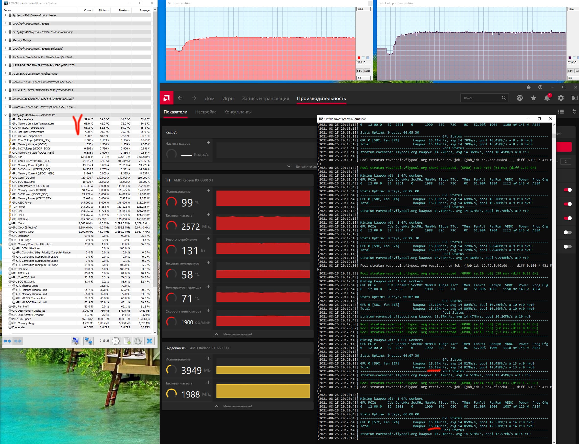 Несмотря на то, что у карт на базе Radeon имеется возможность получать температуру нагрева микросхем памяти GDDR6 (мы помним, что GDDR6X имеет свой датчик температуры, и его уже используют некоторые программы слежения за состоянием ПК типа HWinfo), эти данные получает ПО AMD, а сторонним программам их, видимо, получить трудно, поэтому температура нагрева памяти в HWinfo то появлялась, то пропадала. Но в целом нагрев был некритичным.