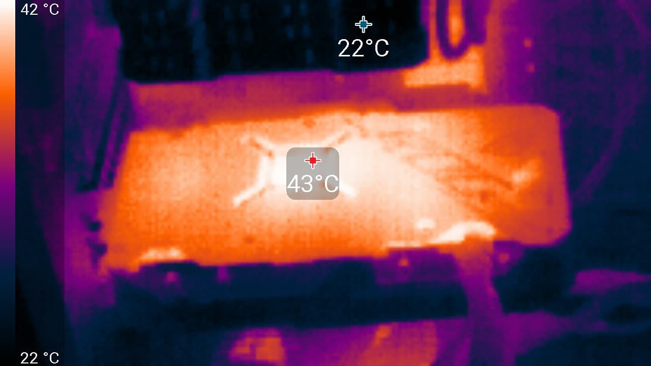 После 2-часового прогона под нагрузкой в OC Mode максимальная температура ядра не превысила 59 градусов, что является очень хорошим результатом для видеокарт такого уровня. Максимальная мощность была зафиксирована на уровне 146 Вт, а максимальный нагрев наблюдался в центре PCB.