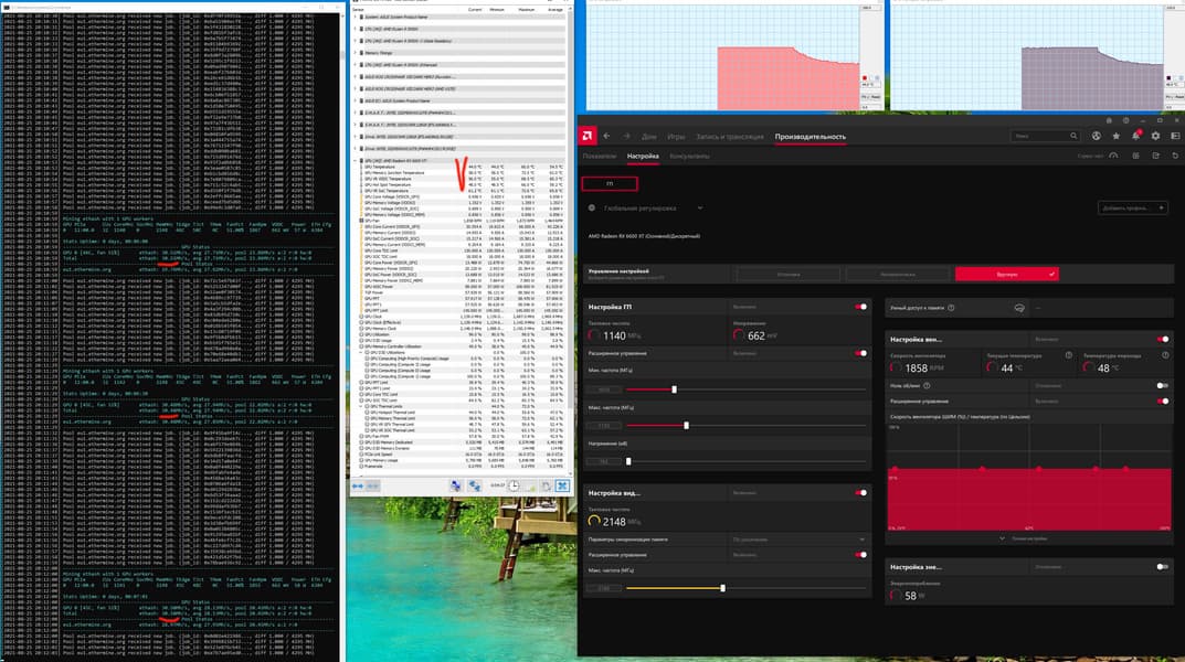 - оптимизация (лимит потребления снижен до 70%, частота GPU снижена на 200 МГц, частота памяти повышена на 500—1000 МГц (в зависимости от карты), вентиляторы выставлены в ручном режиме на 80%)