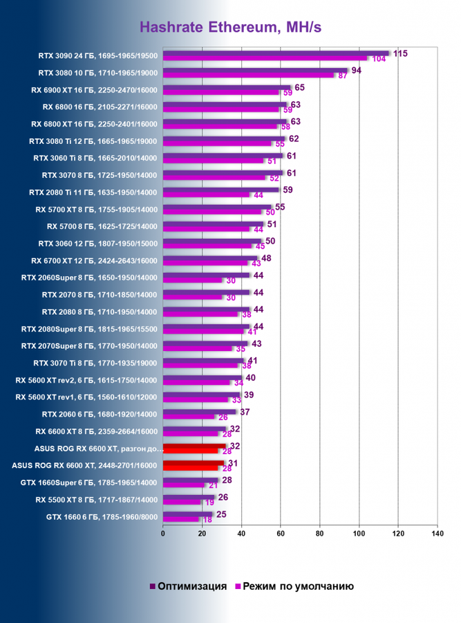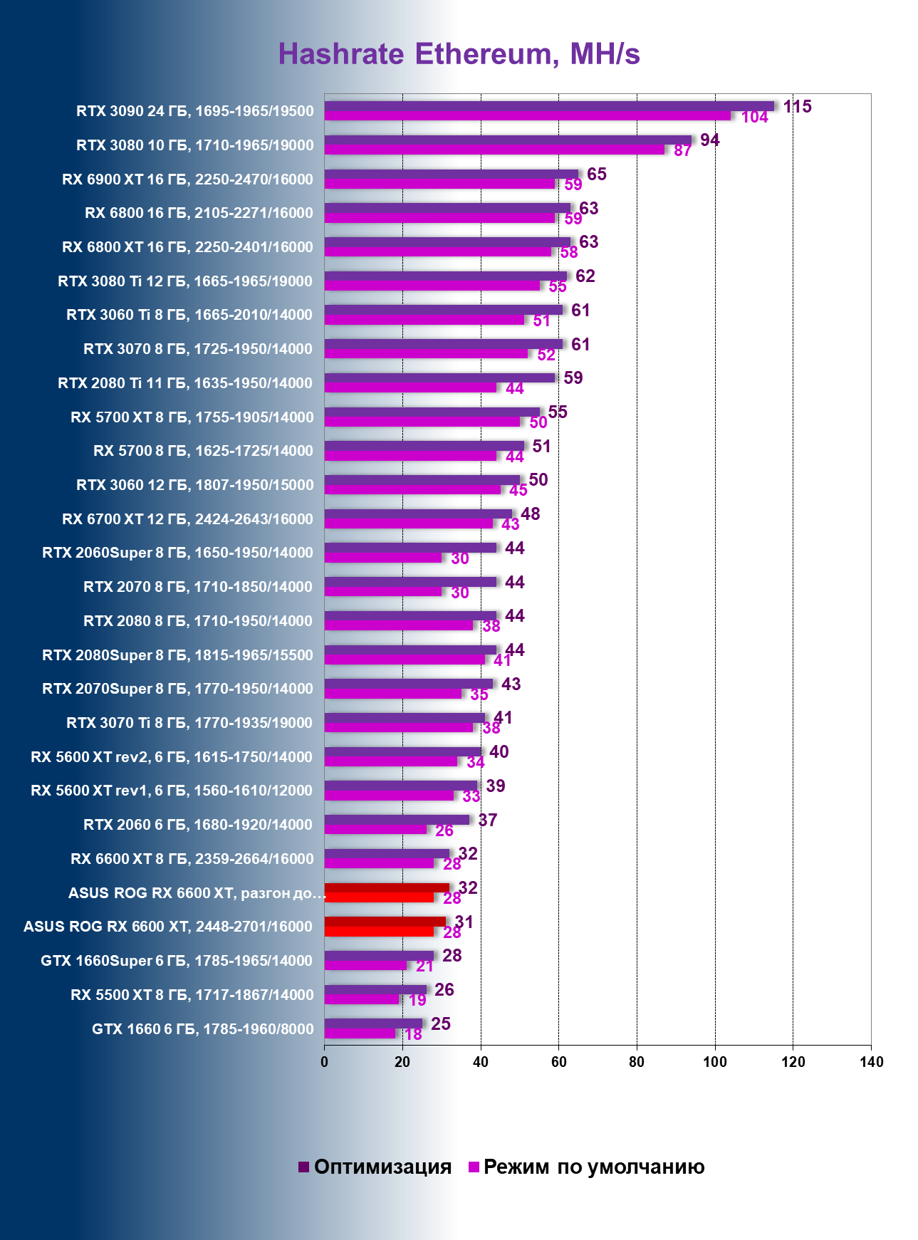 | 03 | Asus ROG RX 6600 XT, 2448—2701/16000 | 35 | 230 | 65 000 |