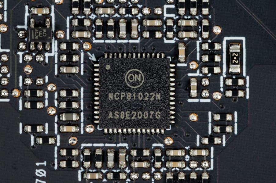 Также есть ШИМ-контроллер NCP81022 (On Semiconductor), управляющий двумя фазами питания микросхем памяти; он также расположен на лицевой стороне печатной платы.