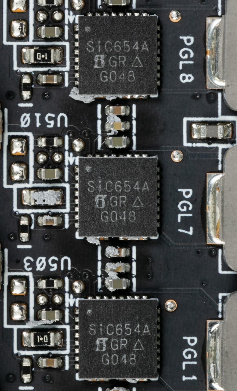 В преобразователе питания GPU, построенном с применением технологии Super Alloy Power II и современных твердотельных конденсаторов (что традиционно для Asus), используются транзисторные сборки DrMOS Vishay — в данном случае SiC654, каждая из которых рассчитана на максимальный ток в 50 А.