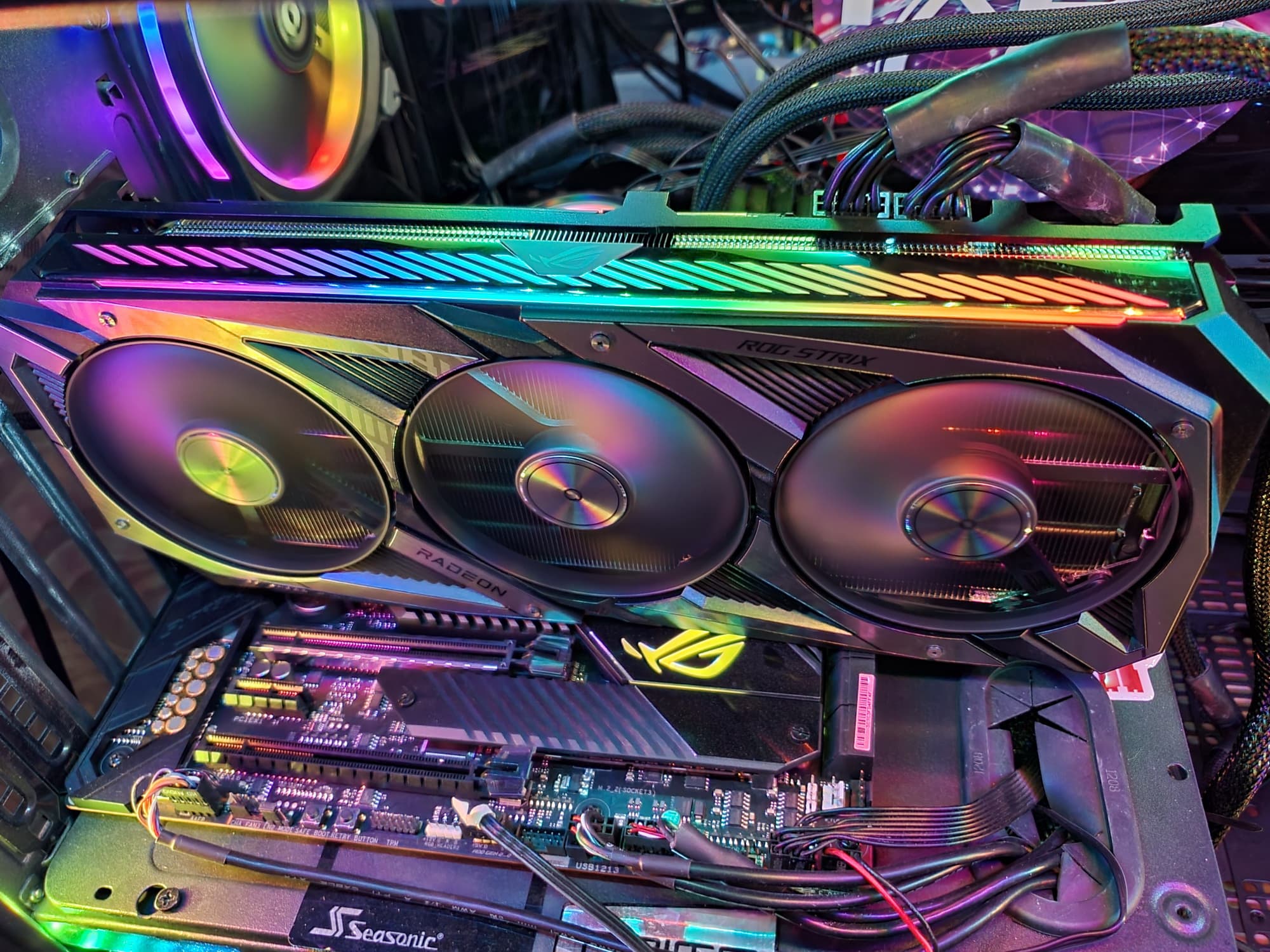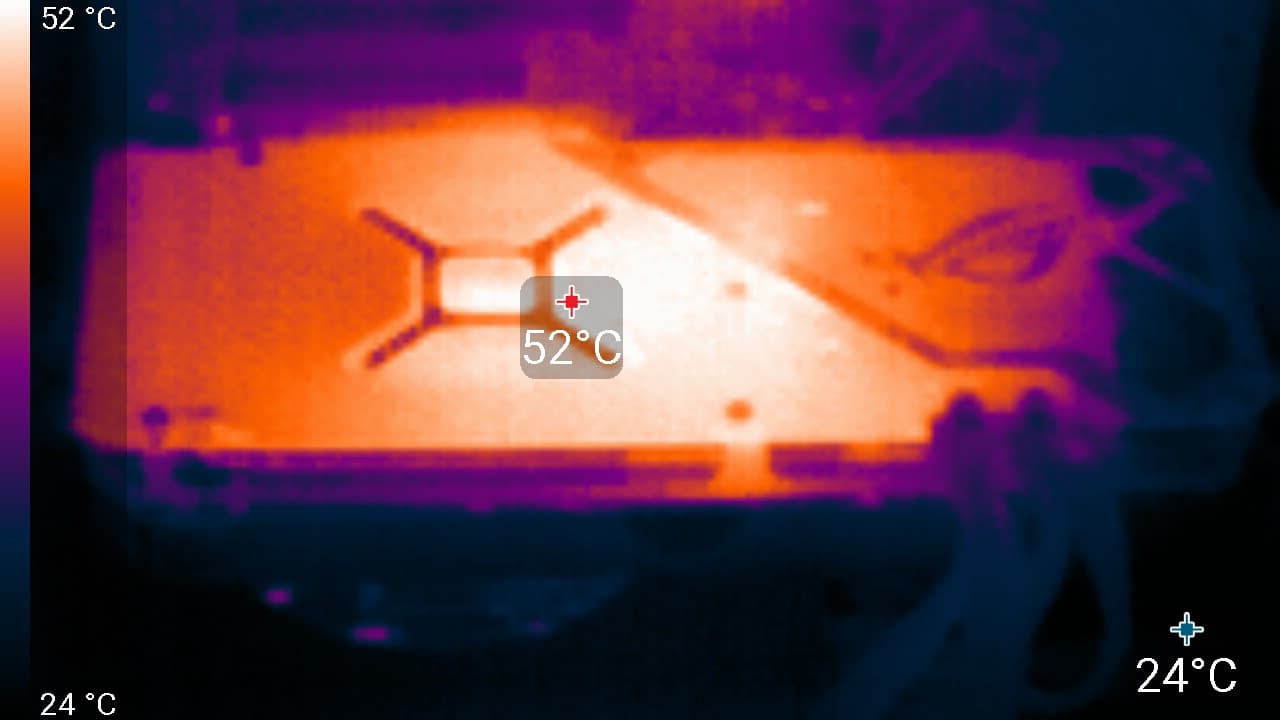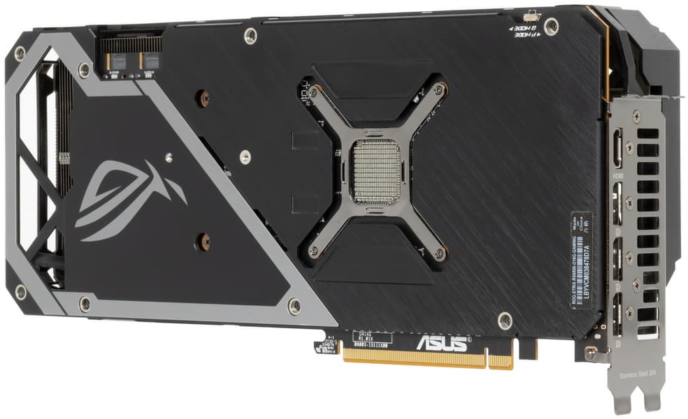 Подсветка у карты реализована на верхнем торце, во вставках около вентиляторов и в логотипе ROG, встроенном в заднюю пластину.