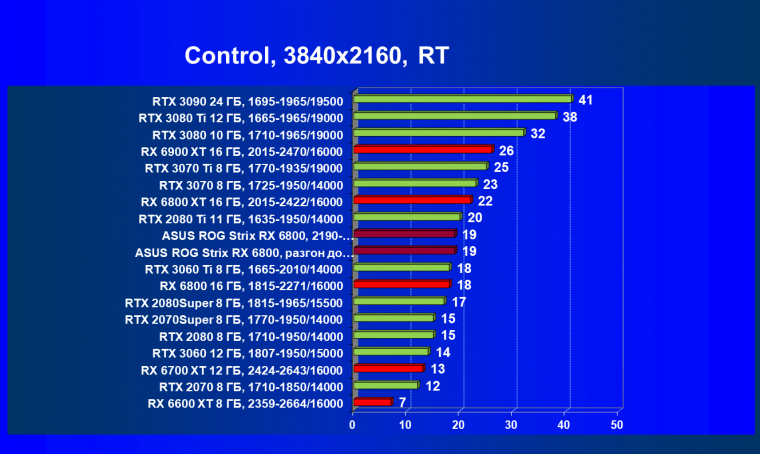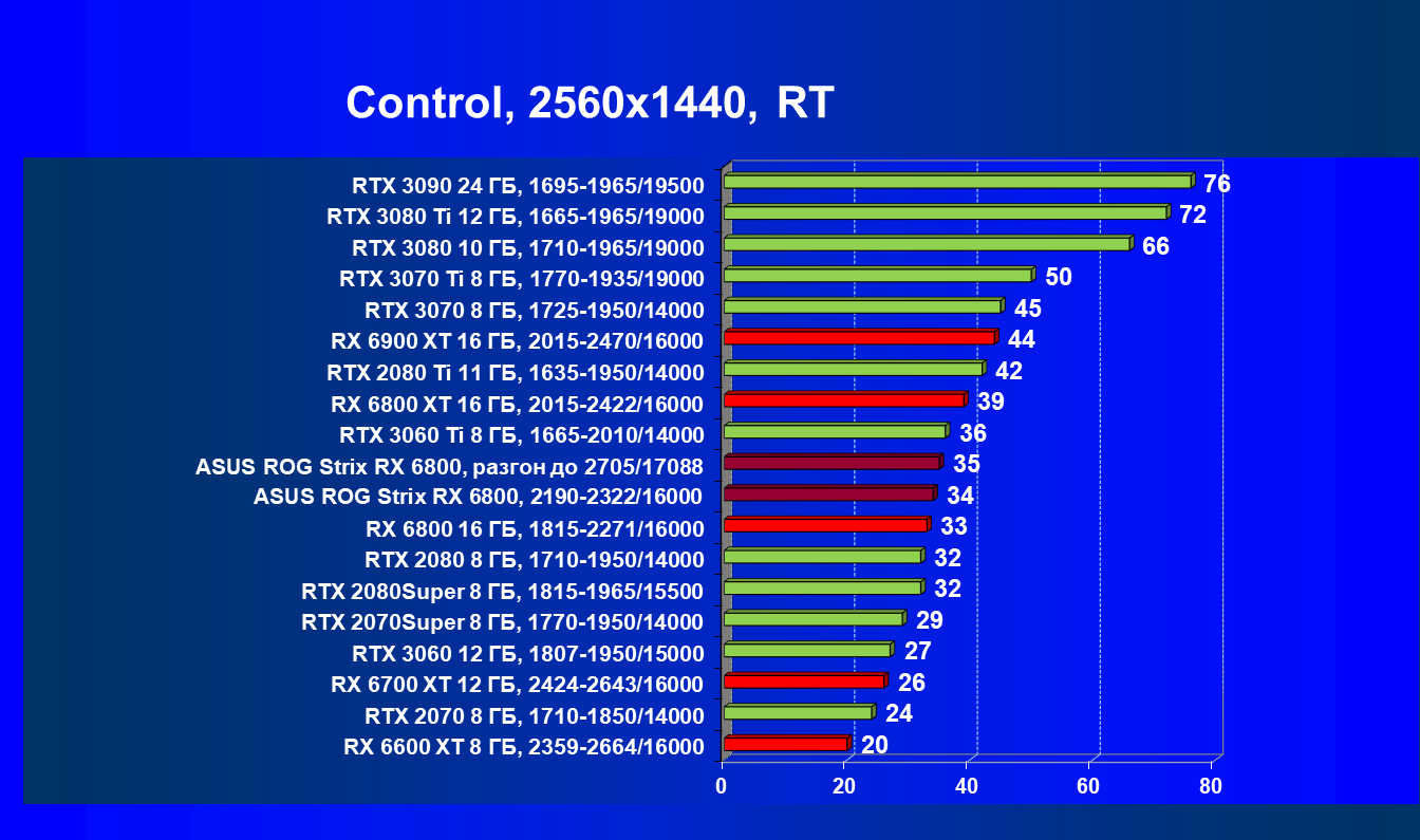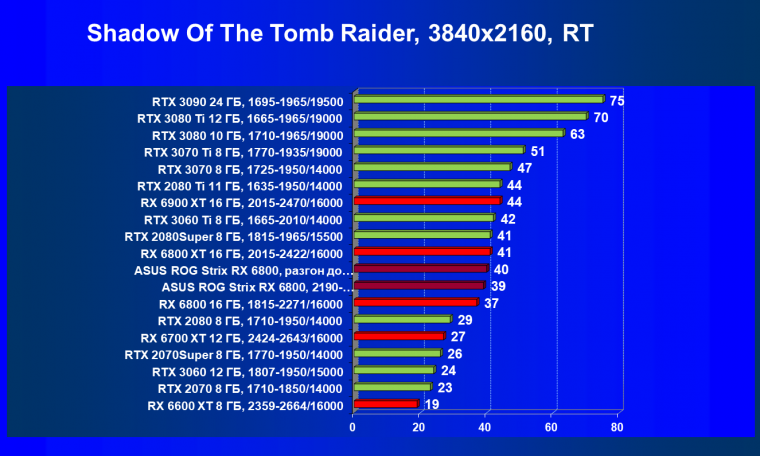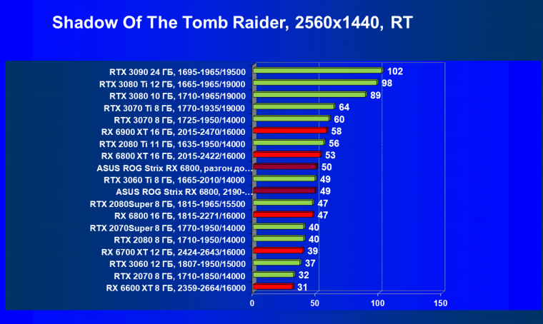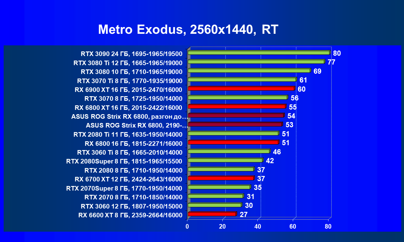 Мы видим, что в классических играх RX 6800 лидирует в группе, правда будучи при этом чуть дороже (до уровня RTX 3080 не дотягивает ни по стоимости, ни по производительности). Карта Asus чуть быстрее референс-аналога из-за повышенных частот работы.