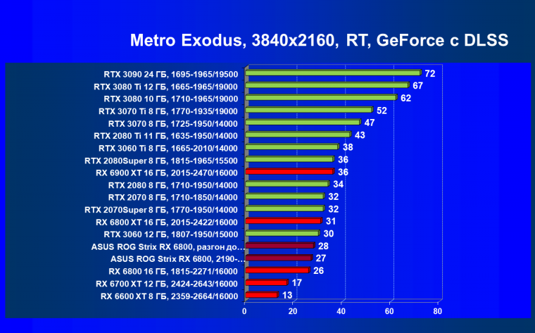 Что касается козыря в виде DLSS у GeForce RTX 30, который значительно повышает производительность, компенсируя падение скорости от включения RT, то мы знаем, что AMD выпустила его аналог — FidelityFX Super Resolution. В ближайшее время мы начнем вводить в список тестов игры с поддержкой FSR.