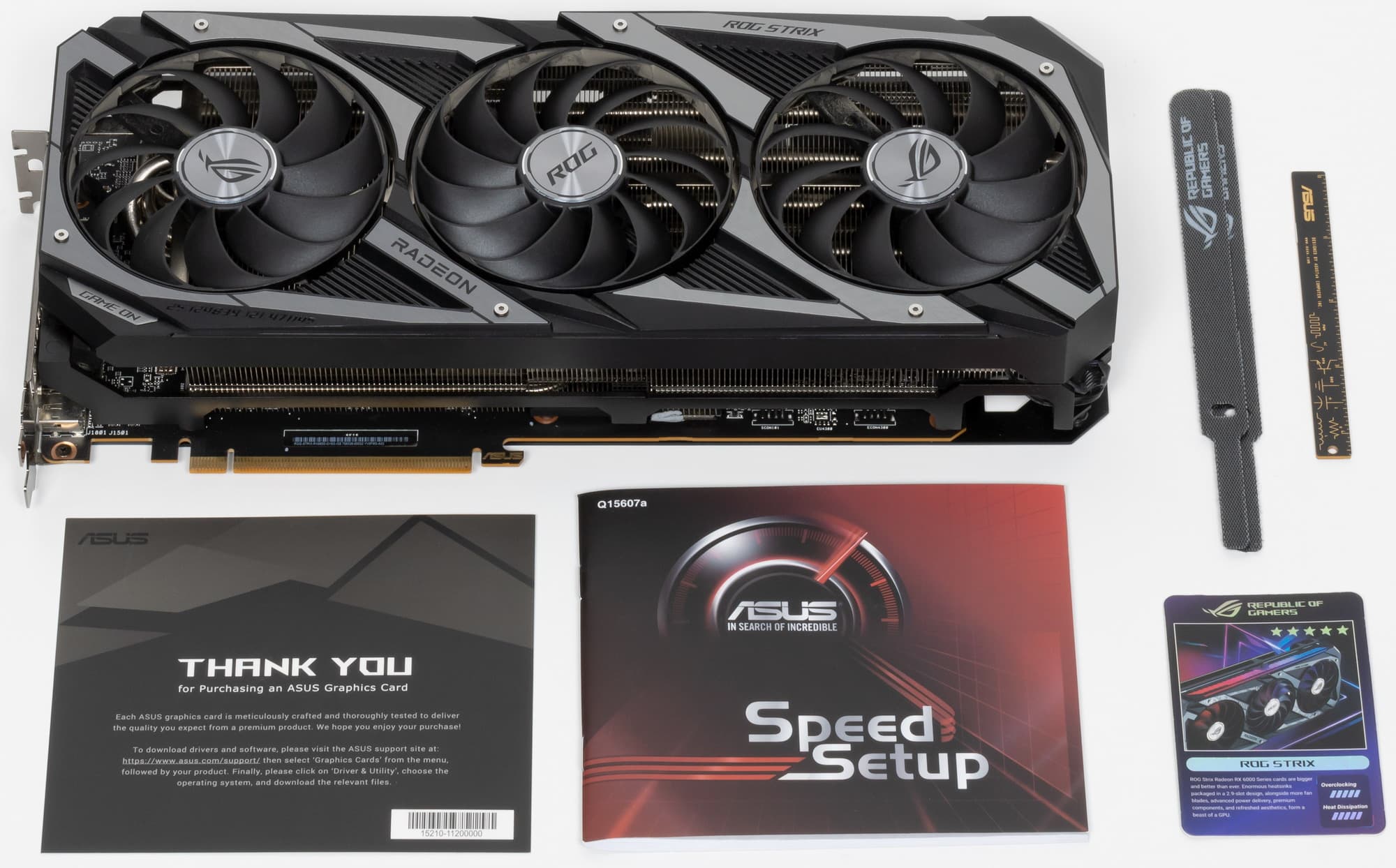 Комплект поставки, кроме традиционного руководства пользователя и карточки ROG, включает мелкие бонусы в виде стяжек и фирменной линейки.