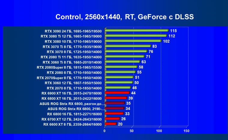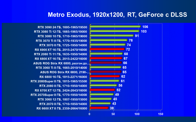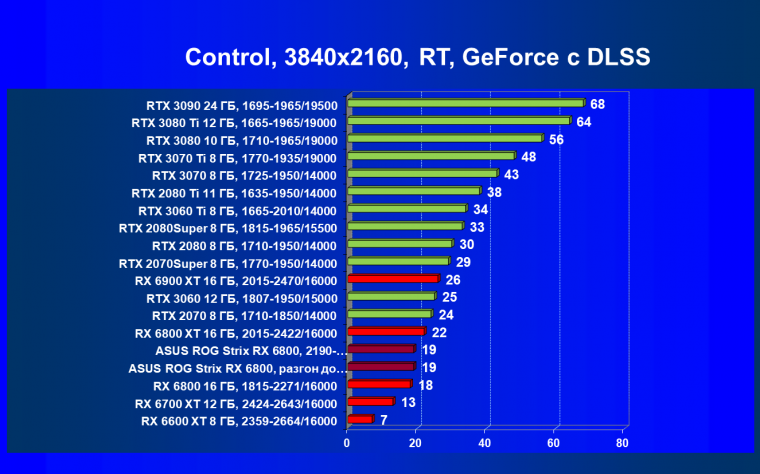 Как и в предыдущем рейтинге, из-за сильного падения производительности в играх с трассировкой лучей все семейство Radeon RX 6000 оказалось в аутсайдерах, а лидируют в группе RTX 3070 Ti и RTX 3070. Поэтому если вы хотите играть «с лучами» в разрешении уровня 4K (а то и 2.5К), то лучше присмотреться к семейству GeForce RTX, хотя там тоже подчас не обойтись без «костылей» в виде DLSS для компенсации падения производительности с RT, а это уже довольно существенно суживает ассортимент игр (поддерживающих и RT, и DLSS одновременно). Игры с поддержкой FSR и RT, что может поднять производительность у Radeon RX 6xxx, мы вскоре начнем вводить, однако пока их крайне мало.