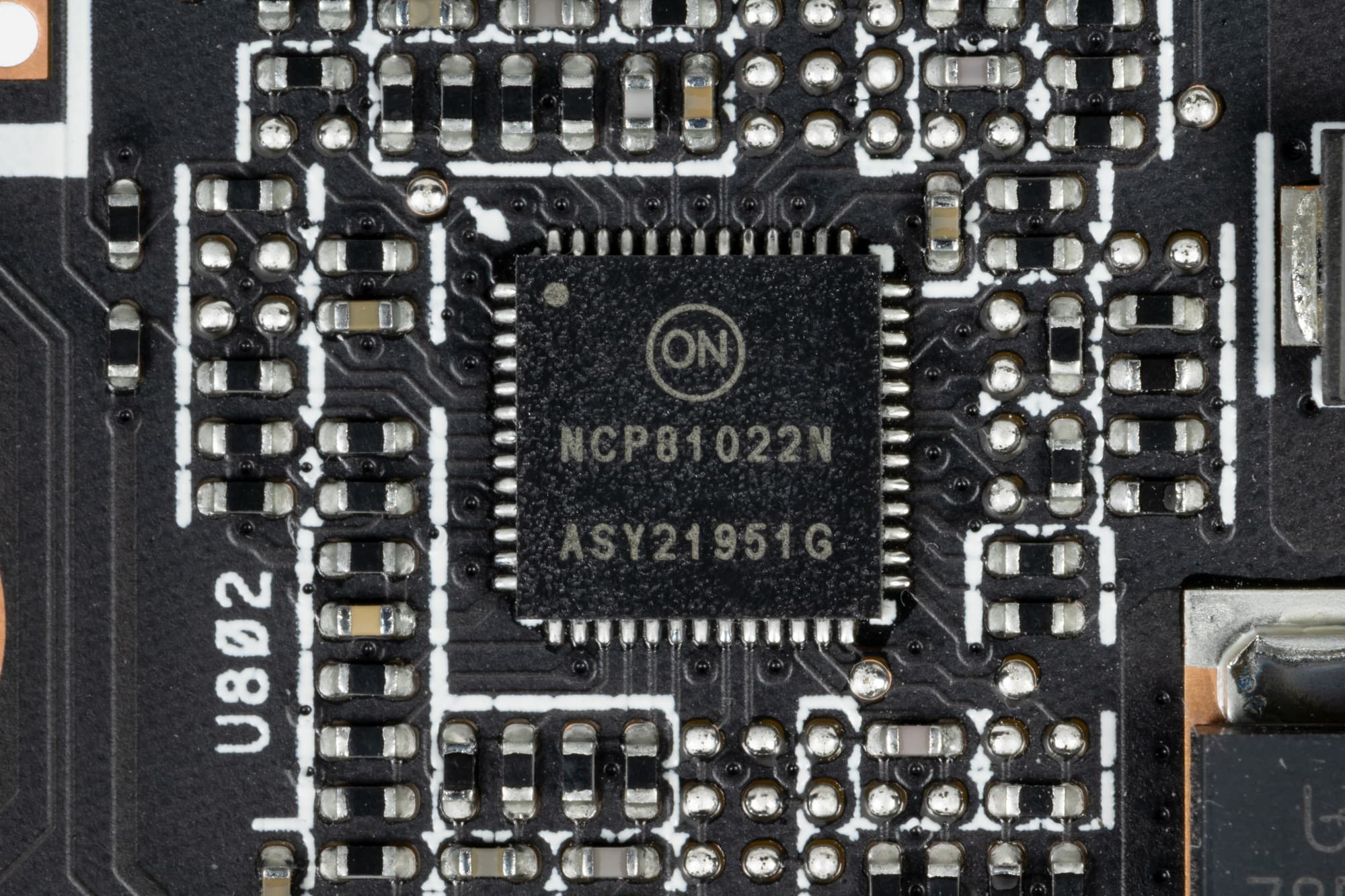 Также есть ШИМ-контроллер NCP81022 (On Semiconductor), управляющий тремя фазами питания микросхем памяти; он также расположен на лицевой стороне печатной платы.