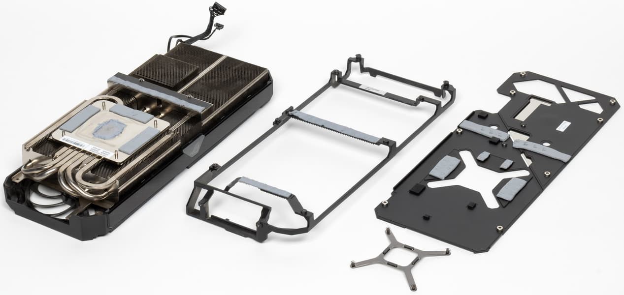 Основой СО является огромный двухсекционный пластинчатый никелированный радиатор с тепловыми трубками, припаянными к подошве прямого контакта с GPU и микросхемами памяти. Этот же радиатор служит охладителем и для некоторых компонентов преобразователей питания VRM с помощью небольшой подошвы. Для остальных мосфетов VRM предусмотрены отдельные радиаторы, размещенные на раме, прикрученной к основному радиатору (рама также служит ребром жесткости всей конструкции, так как прикручивается к крепежной планке видеокарты). Задняя пластина выполнена из алюминия с электрозащитным покрытием и имеет двойное предназначение: служит элементом защиты PCB и через термоинтерфейс участвует в охлаждении оборотной стороны карты в зонах микросхем памяти и преобразователей питания.