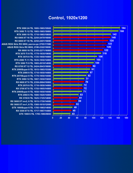 Рейтинг составлен по всем тестам без использования технологий трассировки лучей. Этот рейтинг нормирован по наиболее слабому ускорителю из группы карт — GeForce GTX 1660 (то есть сочетание скорости и функций GeForce GTX 1660 приняты за 100%). Рейтинги ведутся по 28 периодически исследуемым нами акселераторам в рамках проекта Лучшая видеокарта месяца. В данном случае из общего списка выбрана группа карт для анализа, в которую входят Radeon RX 6800 и его конкуренты.