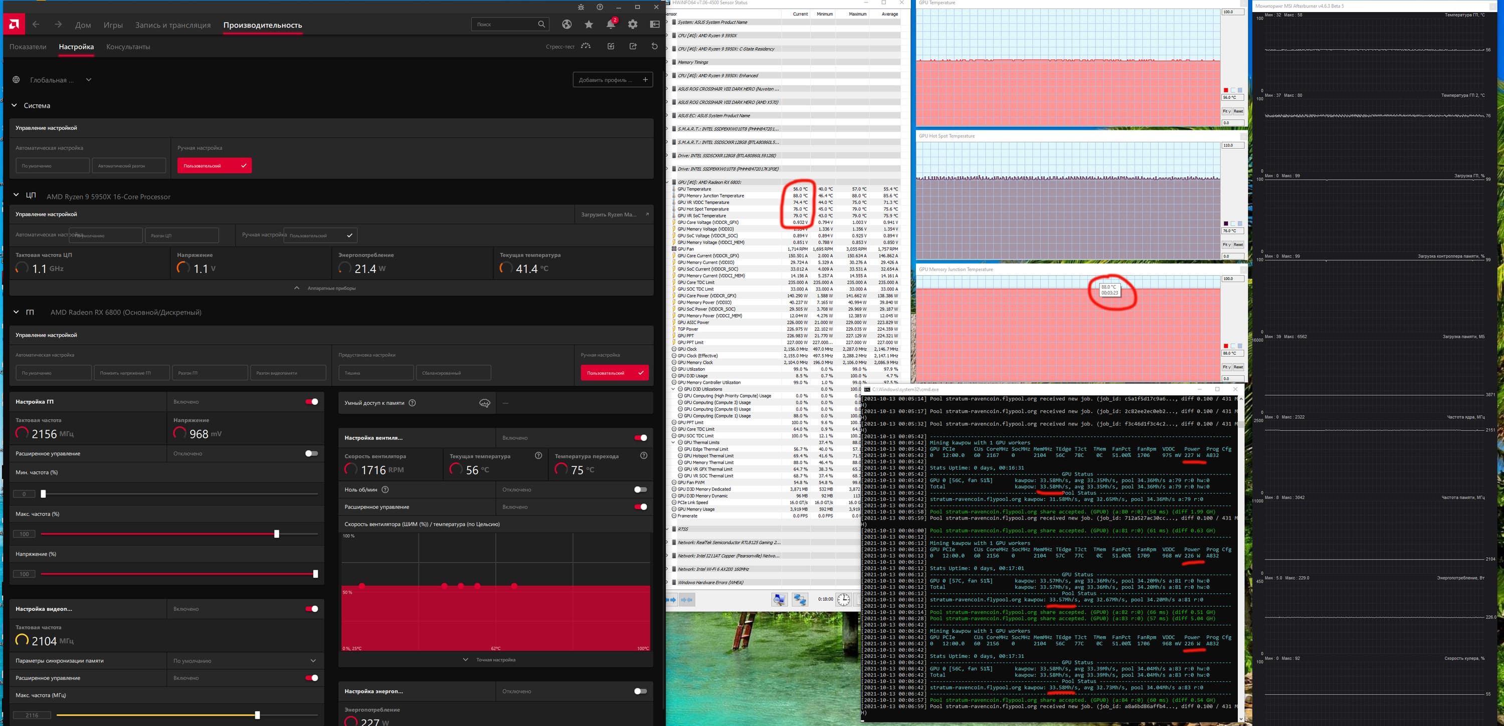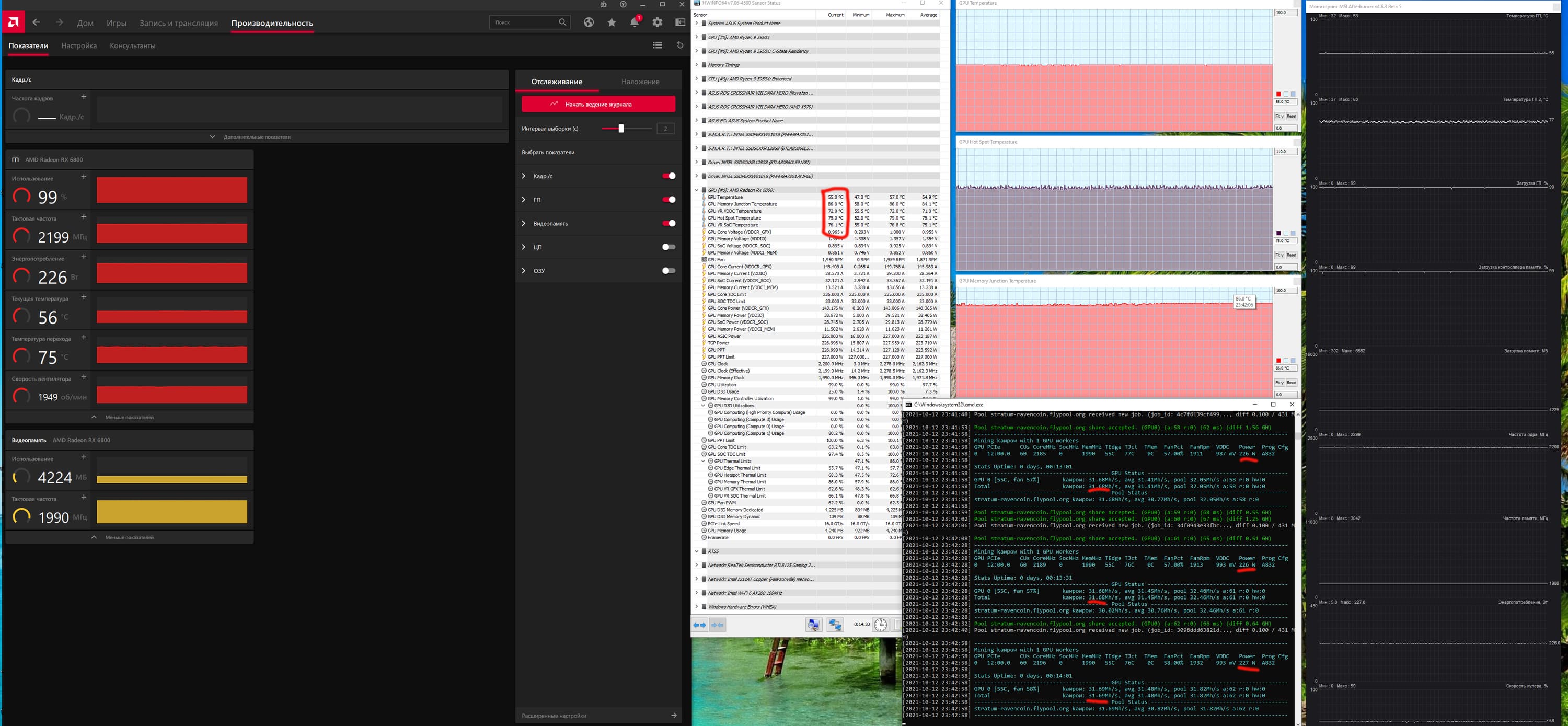 RVN, как известно, отличается большей требовательностью, поэтому карта уже «кушает» 225 Вт. Нагрев в целом тоже чуть выше (память до 86°С). При этом имеем 31,5 MH/s. (У разных криптовалют — разные хэшрейты, сравнивать их между собой нельзя, сравнивать карты можно только в рамках работы по одному алгоритму.)