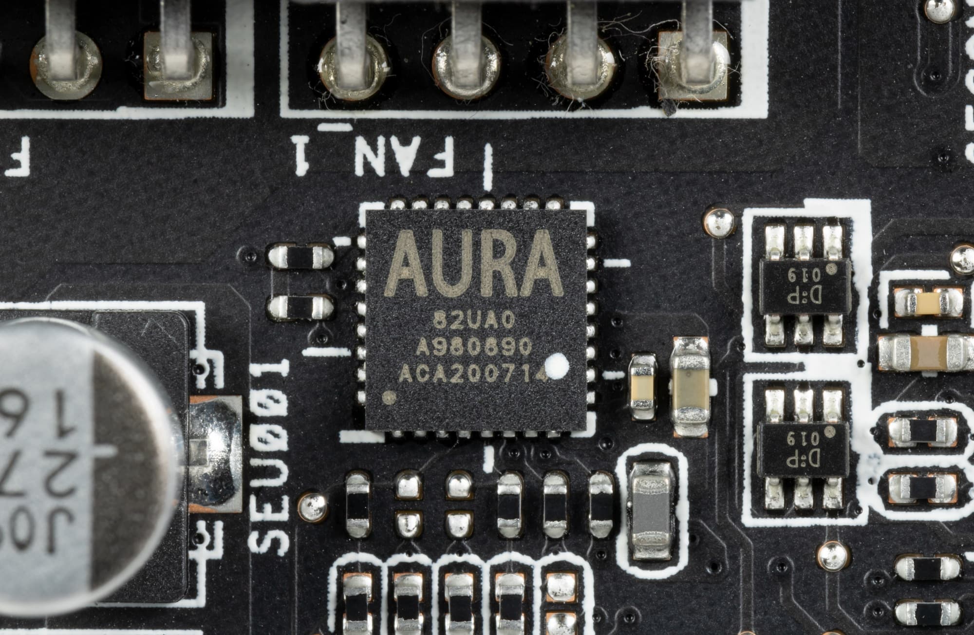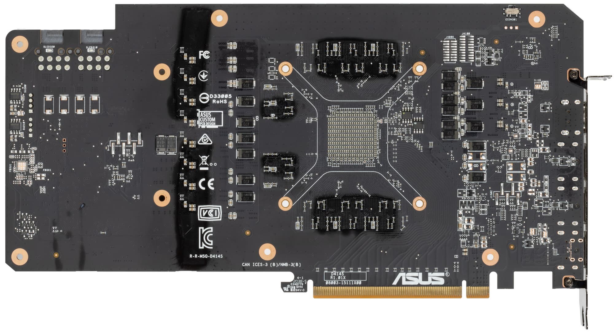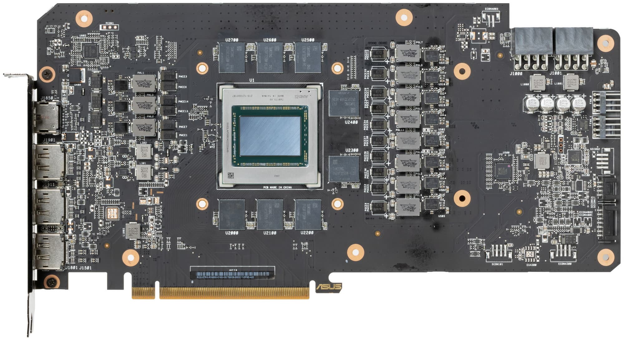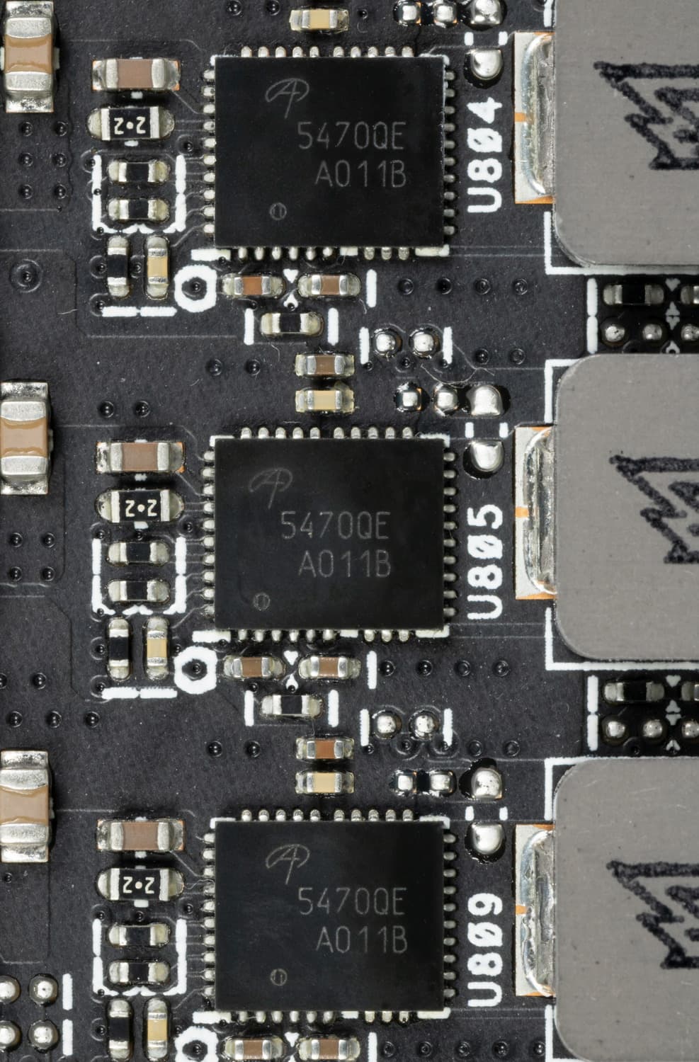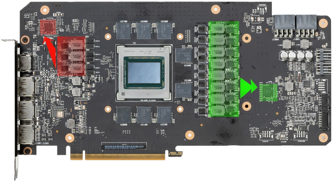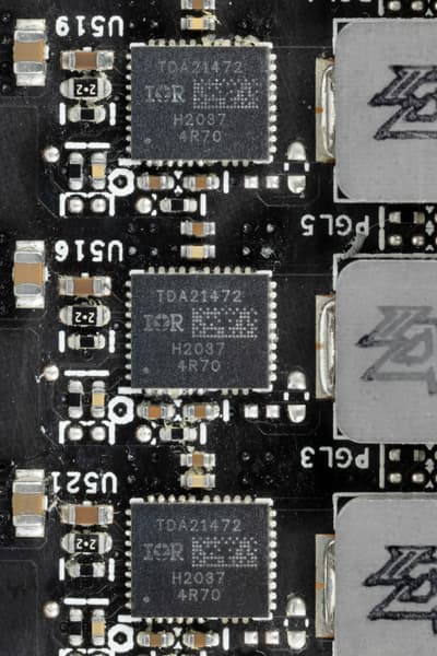 В преобразователе питания GPU, построенном с применением технологии Super Alloy Power II и современных твердотельных конденсаторов (что традиционно для Asus), используются транзисторные сборки DrMOS: TDA21472 от Infineon для фаз питания GPU и AOZ5470QE от Alpha&Omega для фаз питания памяти, каждая из которых рассчитана на максимальный ток в 50 А.