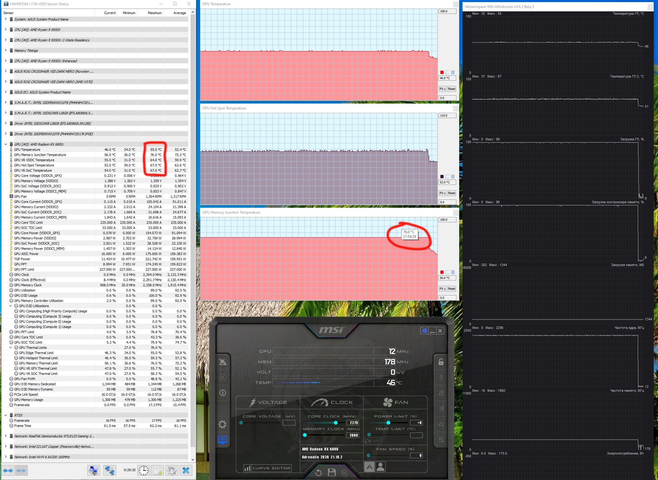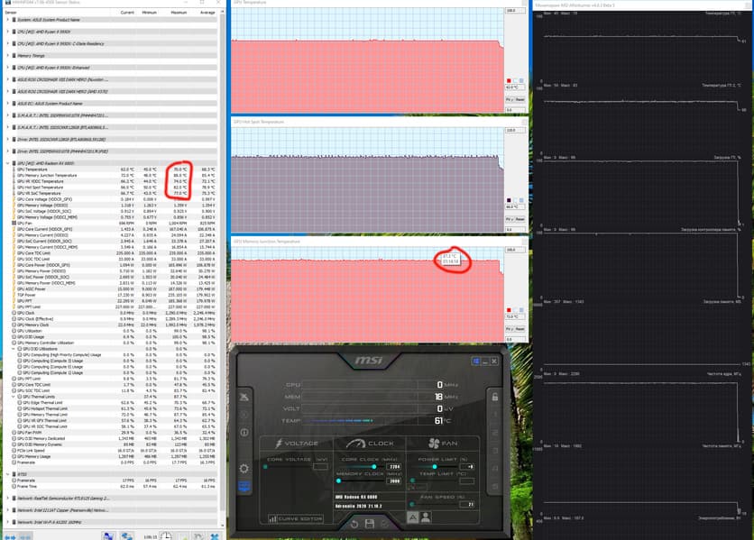 У карт на базе Radeon имеется возможность получать температуру нагрева микросхем памяти GDDR6 через ПО AMD (мы помним, что микросхемы GDDR6X имеют свои датчики температуры, и эти данные уже используют некоторые программы слежения за состоянием ПК типа HWinfo). И нагрев в целом был некритичным.