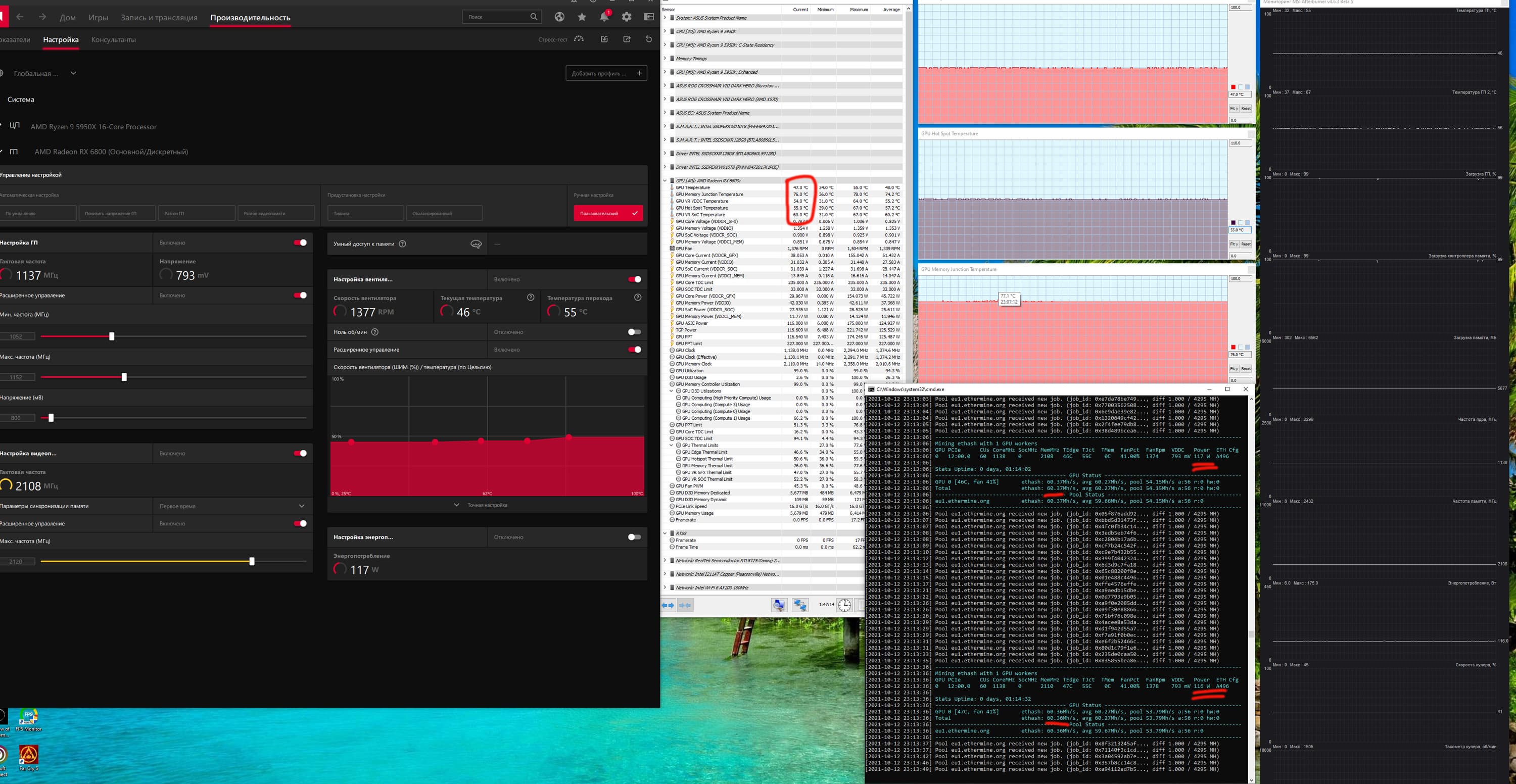 Для подсчета хэшрейта (hashrate) при майнинге «эфира» (Ethereum/ETH/ETC) и «вороны» (Ravencoin/RVN) использовался майнер T-Rex (0.21.06), фиксировался средний показатель за час в двух режимах: