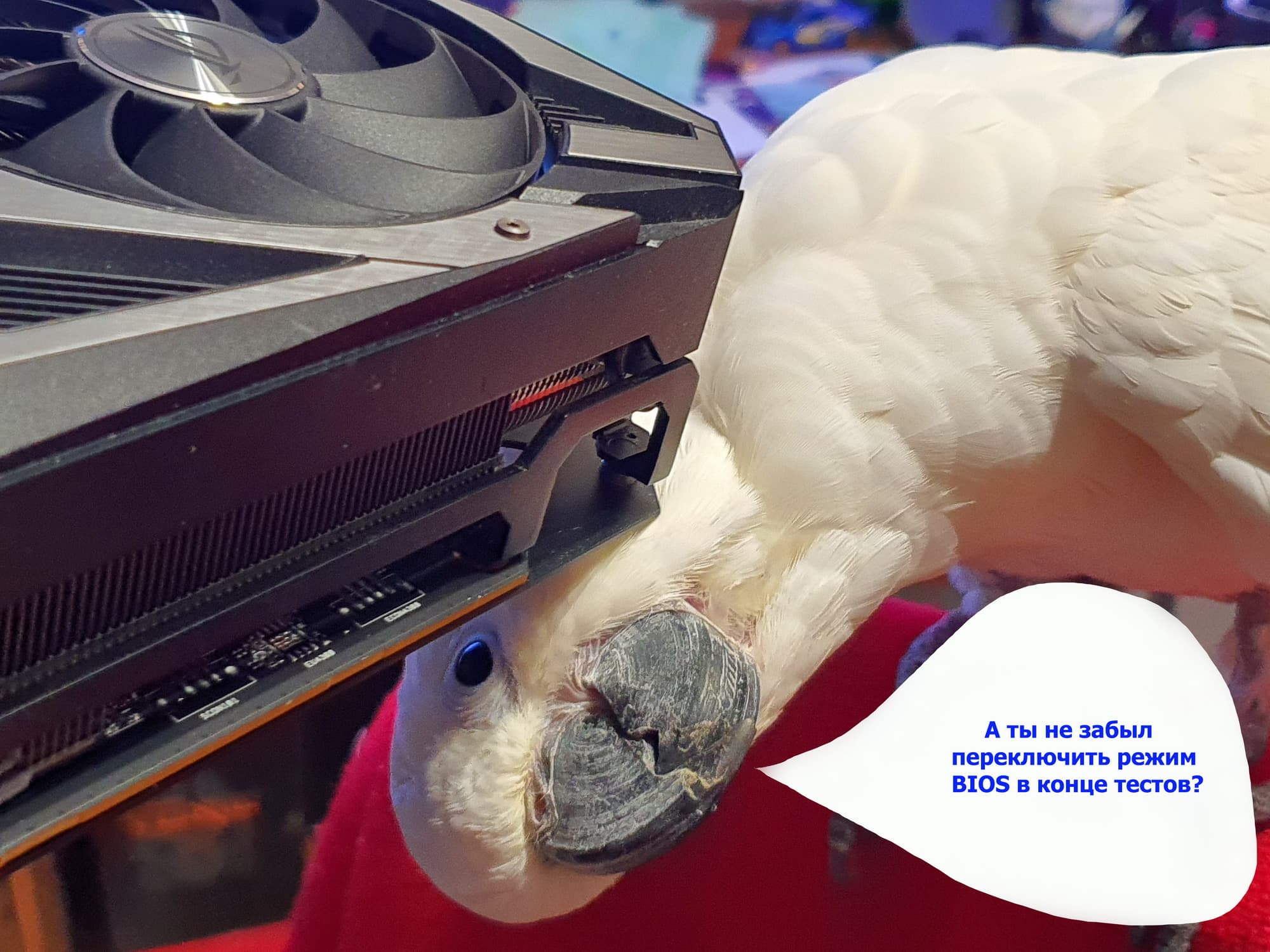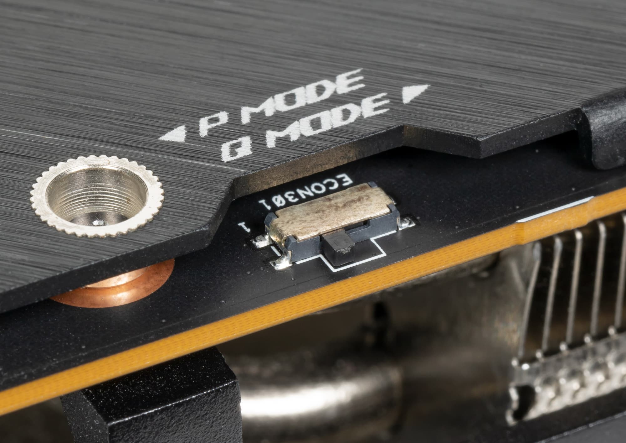Видеокарта традиционно для серии ROG Strix имеет два варианта BIOS и переключатель на верхнем торце карты.