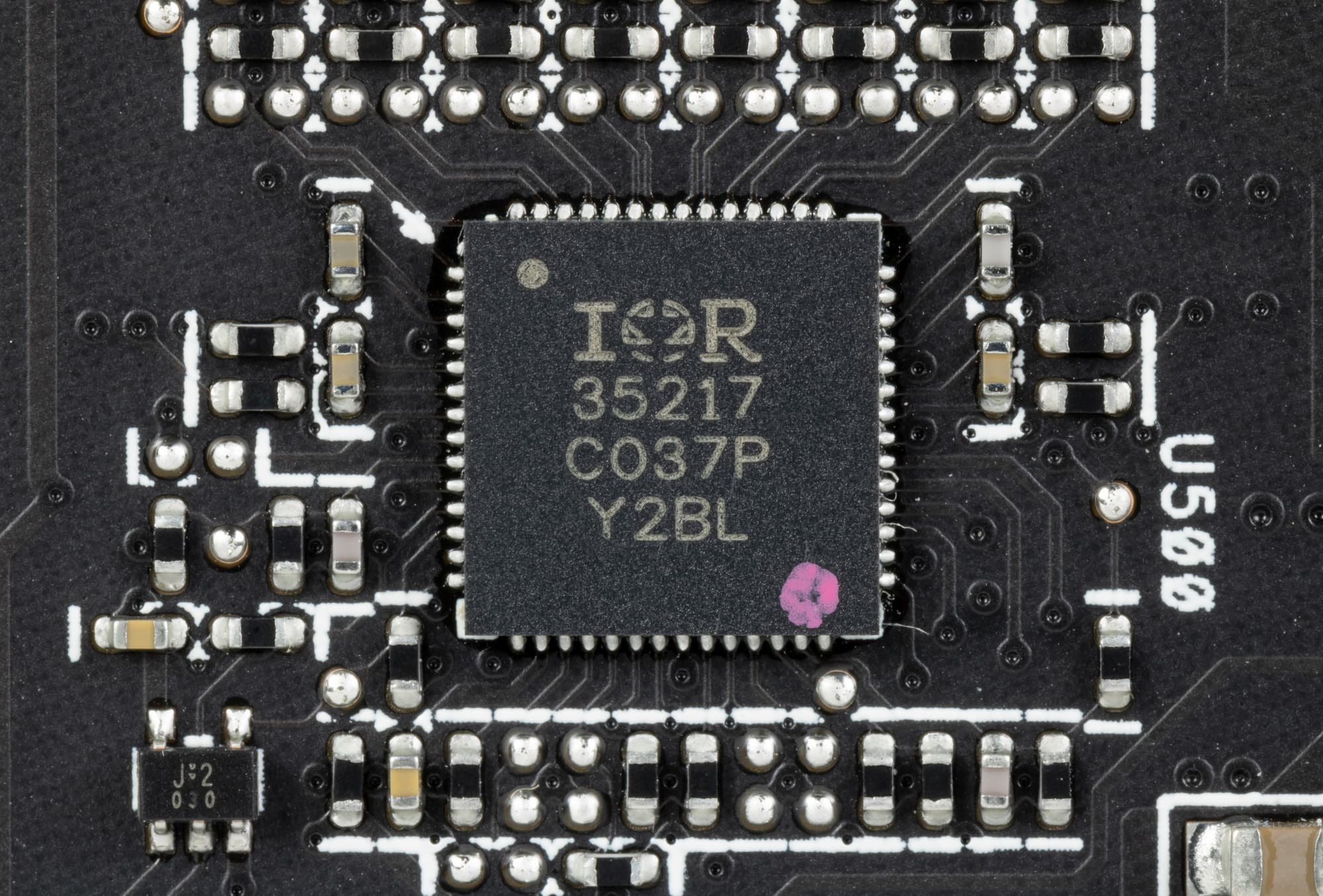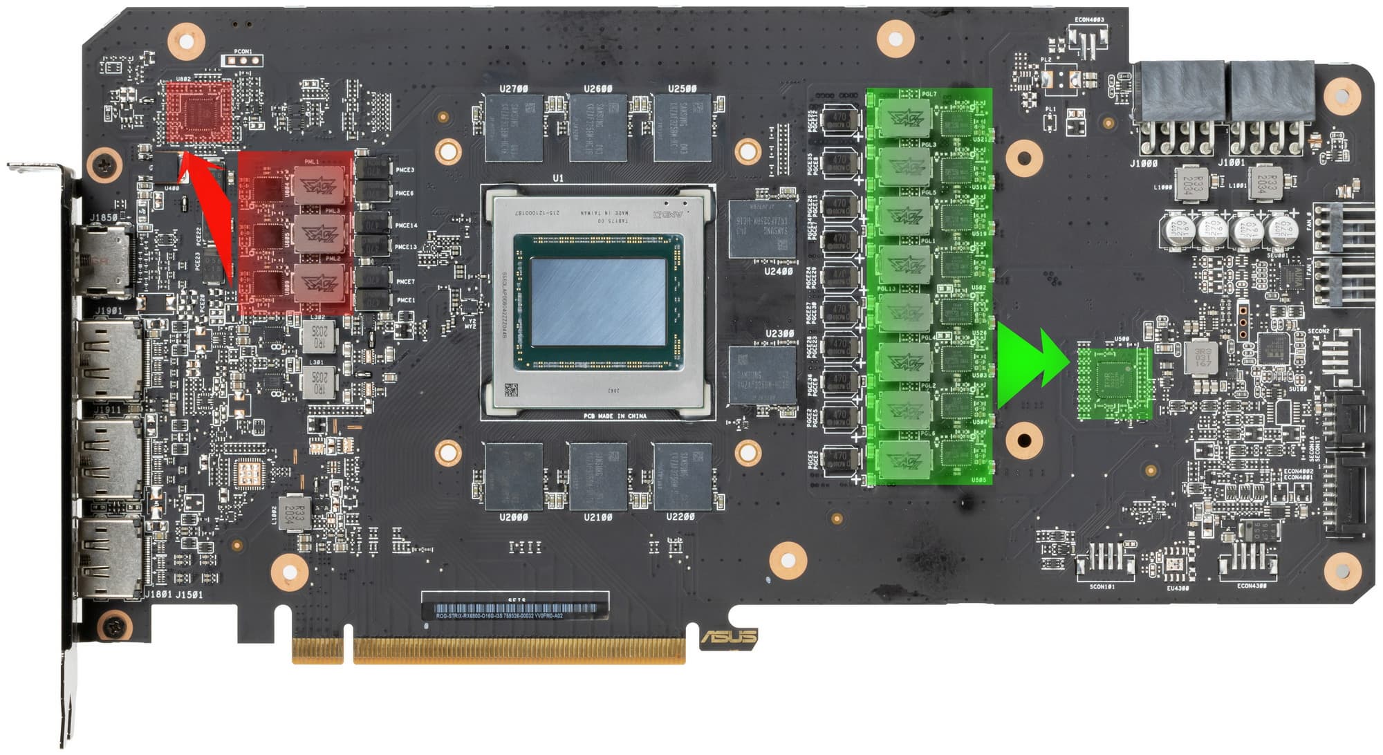 Зеленым цветом отмечена схема питания ядра, красным — памяти. ШИМ-контроллер IR35217 (IOR/Infineon) управляет 8 фазами питания GPU.