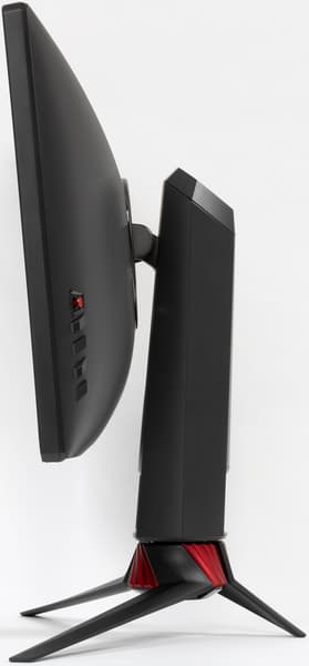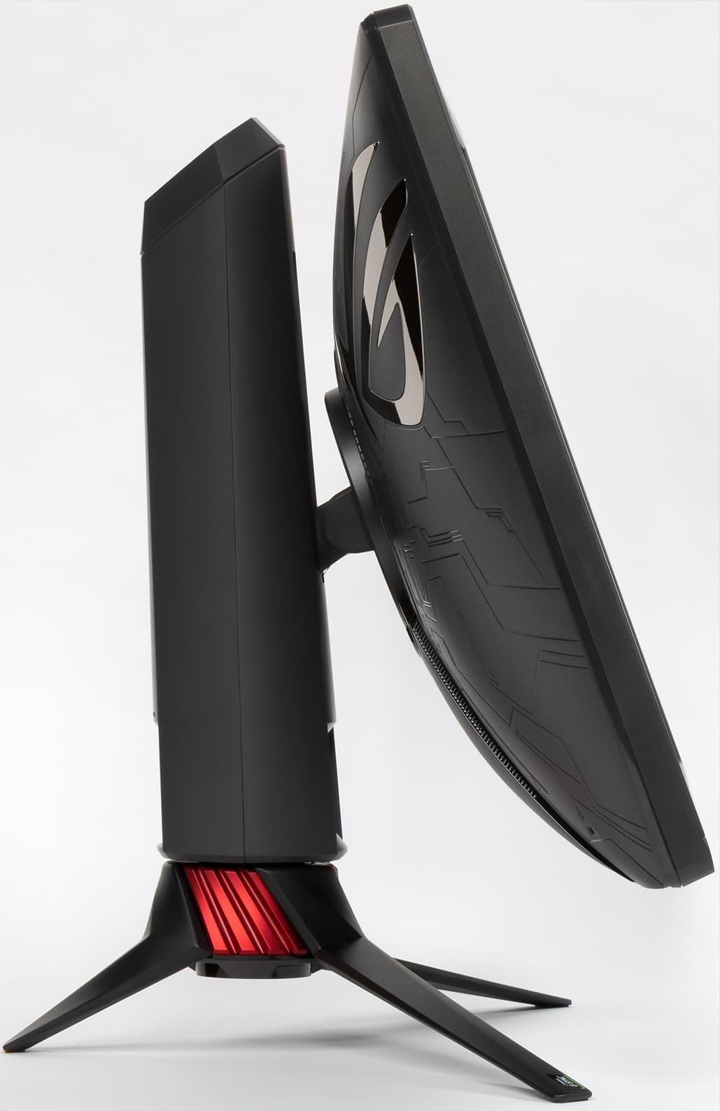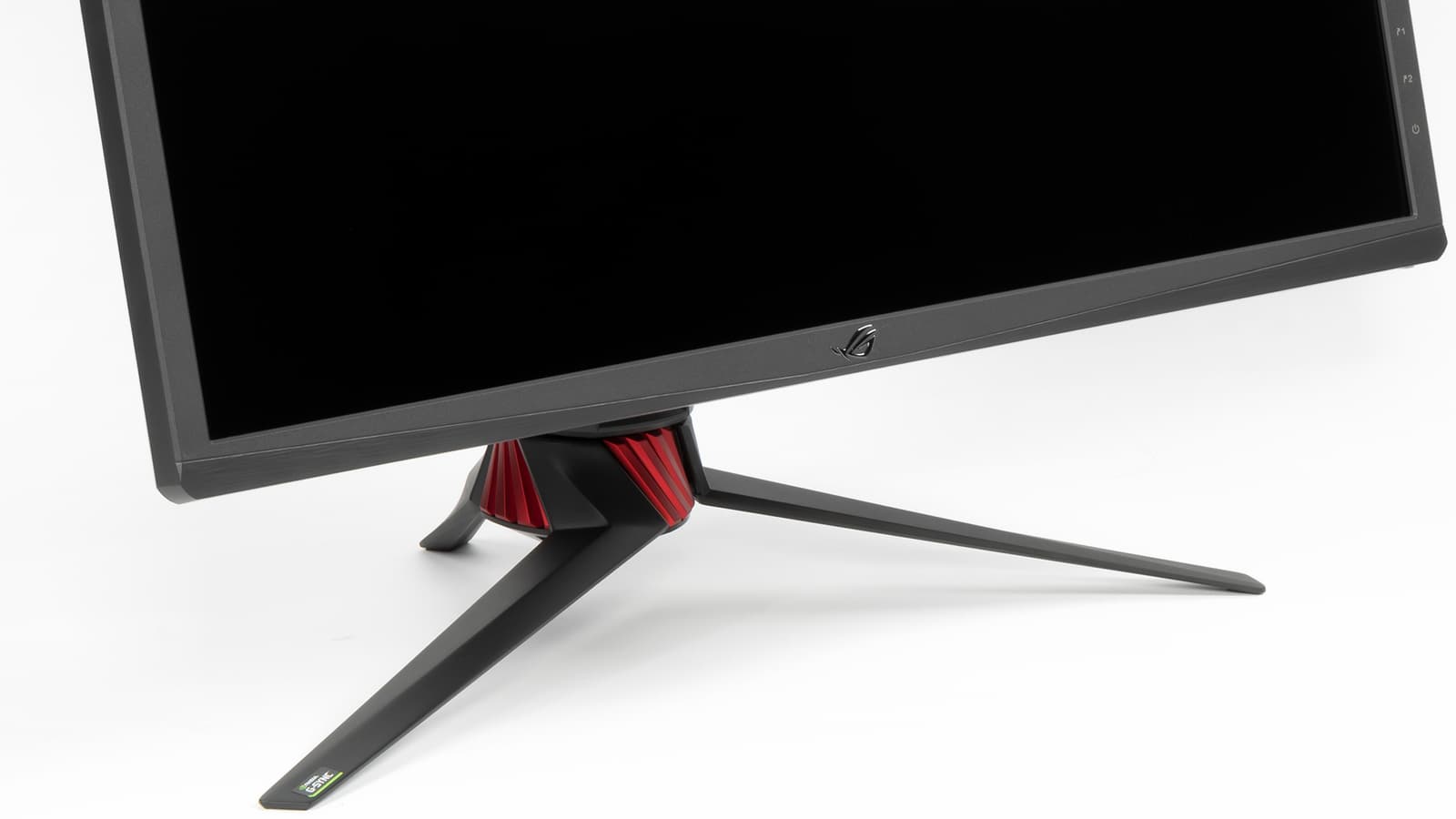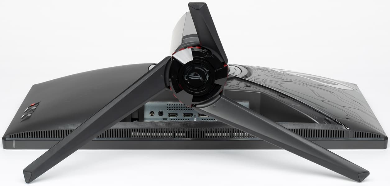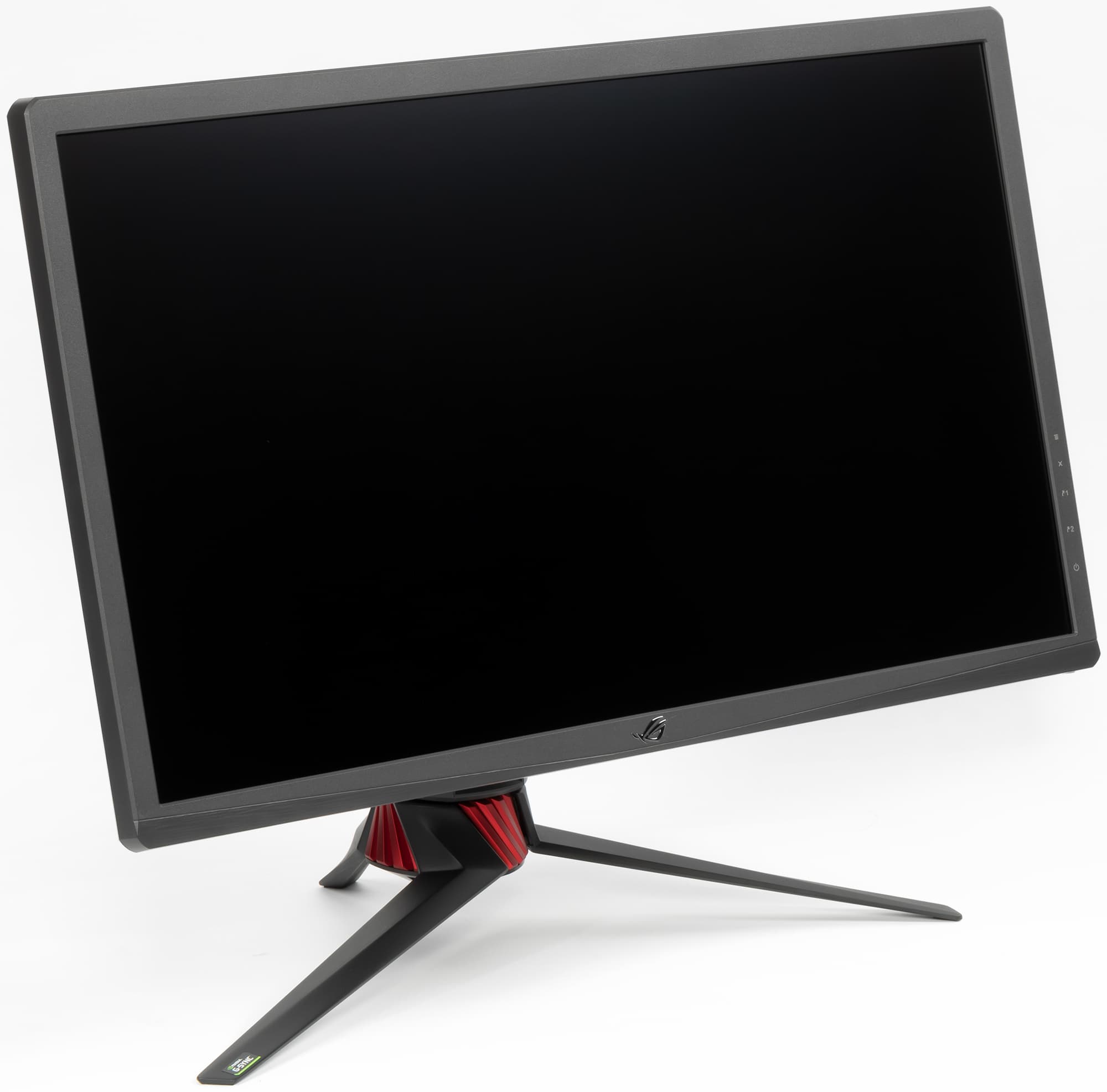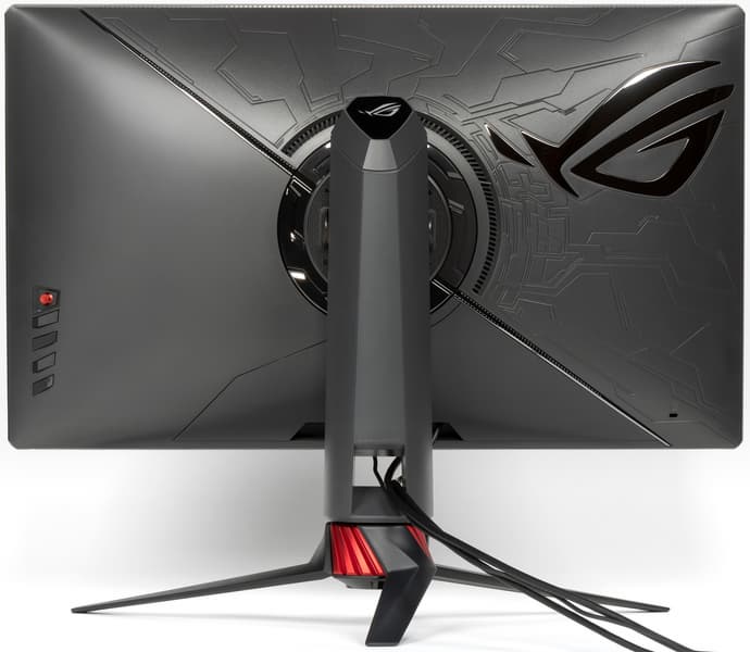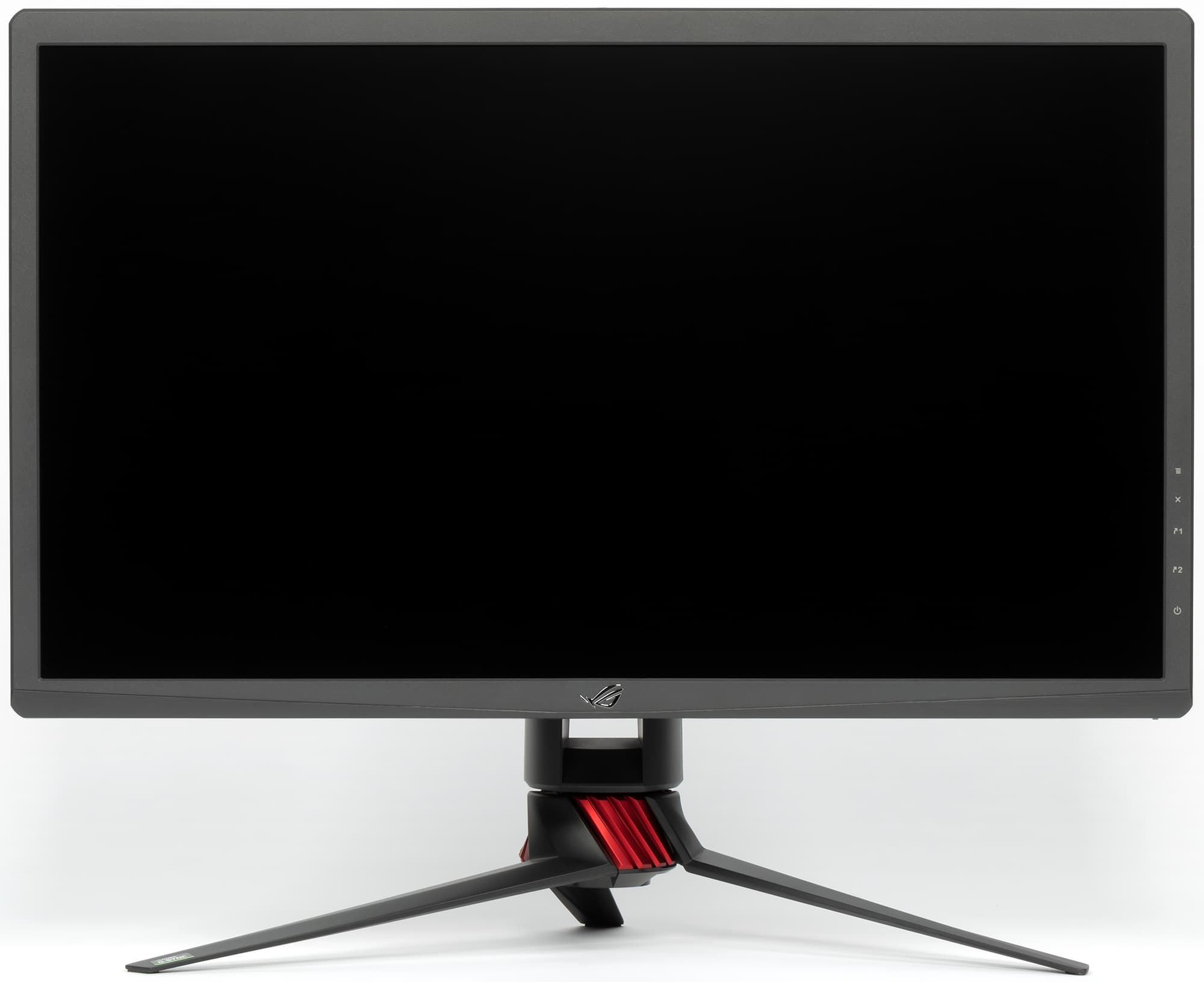 Монитор выполнен в узнаваемом стиле игровых мониторов серии ROG компании Asus. Панели и кожухи блока экрана изготовлены из темно-темно-серого (почти черного) пластика, в основном с матовой поверхностью, местами с мелкой рельефной фактурой и геометрическим узором, но есть и небольшие детали с зеркально-гладкой поверхностью. Внешняя поверхность матрицы черная, полуматовая (зеркальность хорошо выражена), внешний слой матрицы жесткий. Внизу по центру фронтальной рамки — блестящий логотип.