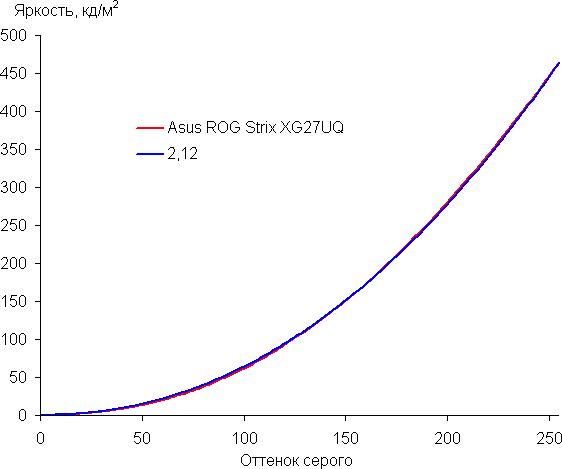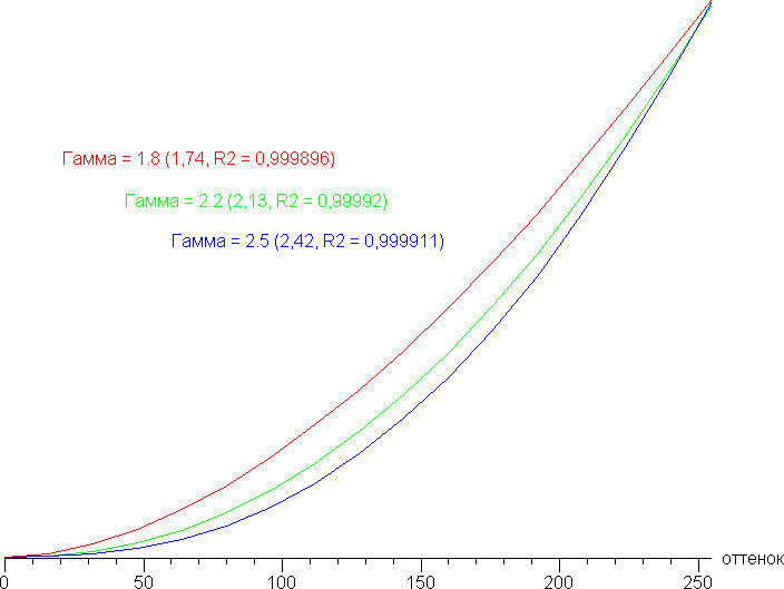 Аппроксимация полученной гамма-кривой дала показатель 2,12, что очень близко к стандартному значению 2,2. При этом аппроксимирующая степенная функция мало отклоняется от реальной гамма-кривой: