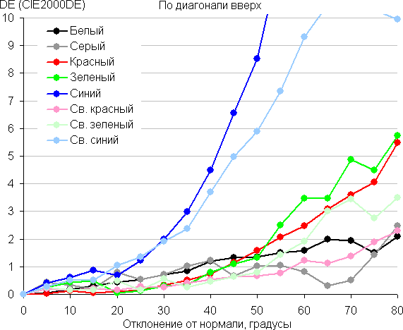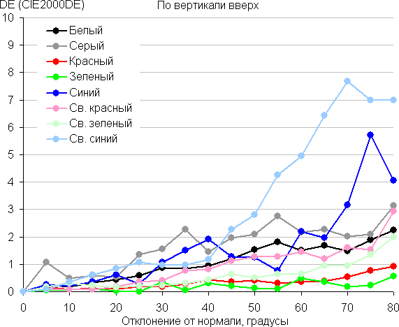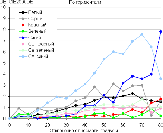 Для количественной характеристики изменения цветопередачи мы провели колориметрические измерения для белого, серого (127, 127, 127), красного, зеленого и синего, а также светло-красного, светло-зеленого и светло-синего полей во весь экран с использованием установки, подобной той, что применялась в предыдущем тесте. Измерения проводились в диапазоне углов от 0° (датчик направлен перпендикулярно к экрану) до 80° с шагом в 5°. Полученные значения интенсивностей были пересчитаны в ΔE относительно замера каждого поля при перпендикулярном положении датчика относительно экрана. Результаты представлены ниже: